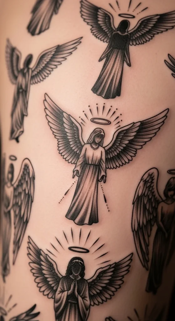 A silhouette with rays creates a clean symbol of guidance. The rays make the angel feel bright without heavy shading. To limit cost, keep the rays straight and evenly spaced. Use a ruler to test spacing on paper first. This style suits the back of the arm or lower leg. You can personalize it by adjusting the number of rays to match an important number in your life. The simplicity also makes this a quick tattoo session.