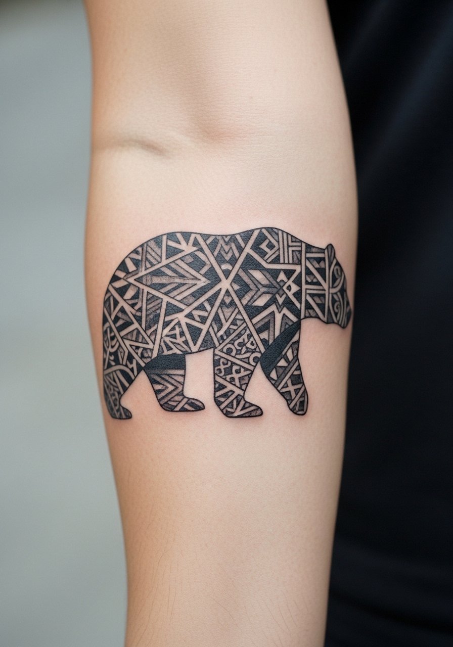 A bear silhouette filled with geometric lines feels modern while carrying primal meanings — strength, protection, grounding. Forearm placement lets it read easily and makes for low-to-moderate pain. Blackwork silhouettes age predictably well because solid black holds up over time. The design’s success depends on crisp edges; ask the artist how they handle solid fills to avoid patchiness. In my experience, geometric fills need careful spacing so tiny triangles don’t bleed together when healed. I recommended a slight negative-space border around key shapes to preserve separation as the skin settles.