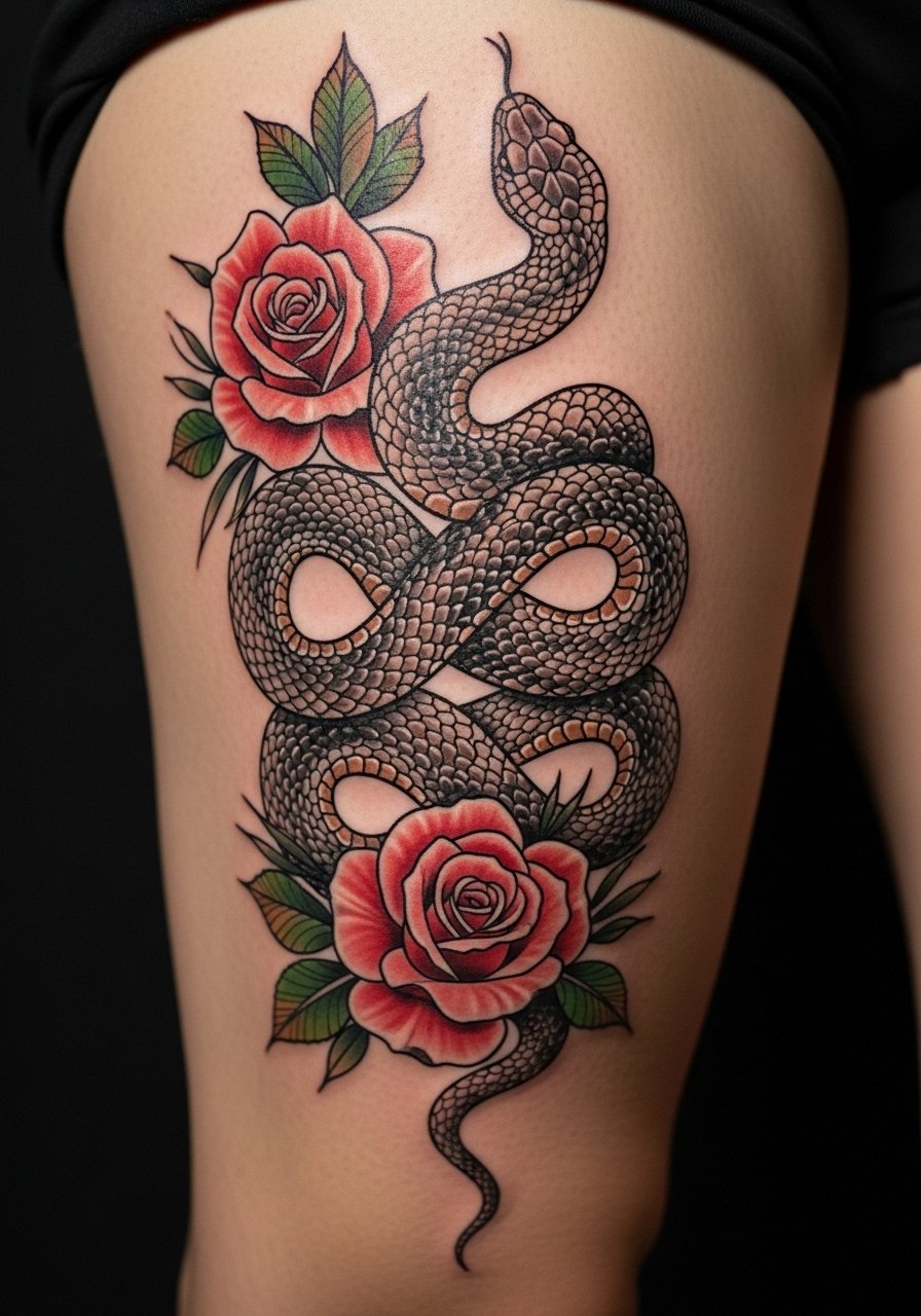 Snakes are about transformation and healing; wrapped with florals they soften the edge. Thigh sleeves or large thigh pieces let the snake coil naturally around muscle contours, which I prefer for motion. Pain on the outer thigh is moderate and tolerable for longer sessions. Scale detail requires an artist who knows how to render texture without crowding the composition; too many tiny scales on small tattoos blur later. I asked my artist to space scales and use varied shading so the snake reads at a glance. Healing on the thigh tends to be forgiving, but avoid tight pants during the first two weeks.
