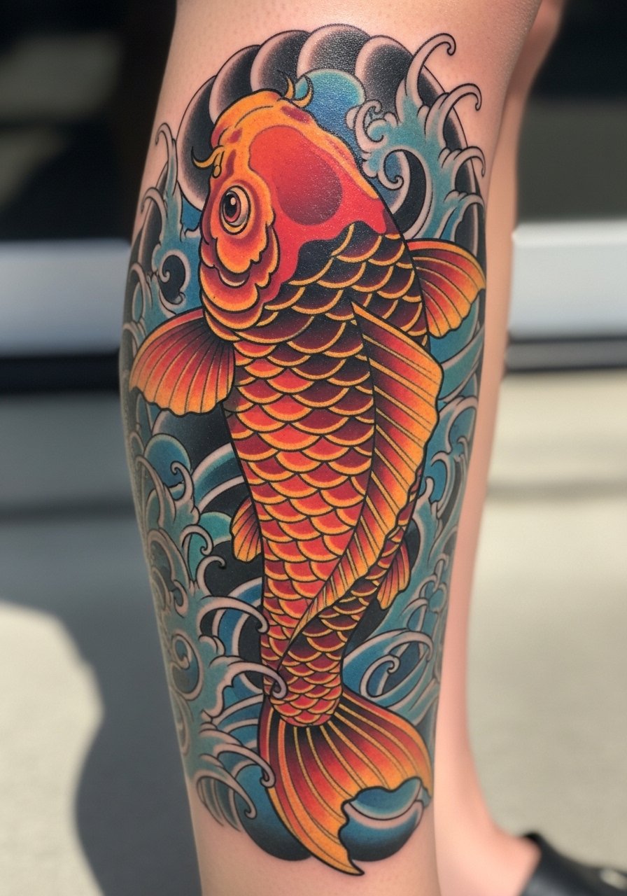 Koi tattoos symbolize perseverance and personal journeys. The calf is ideal because it gives vertical flow for koi movement and sits away from clothing friction. Color realism makes the fish feel alive; healed colors soften a bit, so artists often saturate shades slightly fresh. Calf pain is moderate and tolerable for most folks. Avoid overly intricate water details that read messy once healed — focus on clear contrast and directional flow. I asked for a slightly muted palette so it doesn’t look neon a year down the line, while retaining strong eye and scale details.