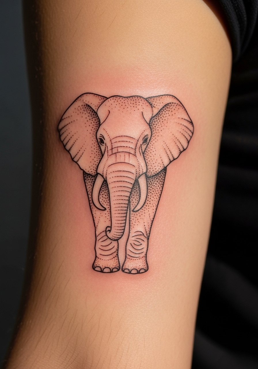 Elephants read as memory and family ties; an upper-arm placement gives a friendly, visible spot without being obtrusive. Fine lines with dotwork can create a soft, textured feel that ages nicely if spacing is respected. Upper-arm pain is generally low, and healing is straightforward. The trap is too-tight dotwork that clumps when healed; I make sure dot spacing is wide enough. My artist suggested a slight contrast in line weight between tusks and ear folds to keep the elephant recognizable from a distance.