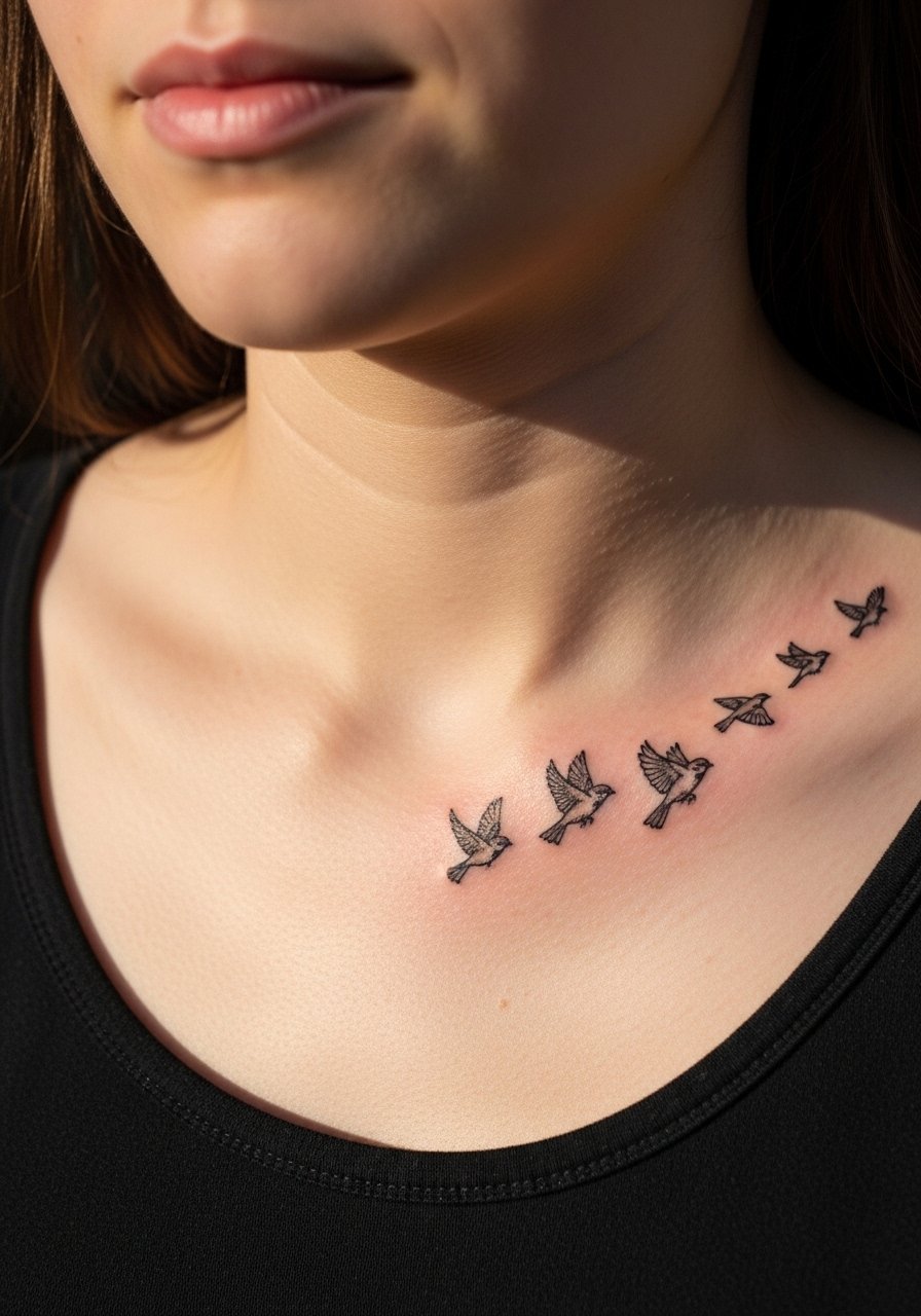 Small flying birds across the collarbone create motion that flat tattoos can't. Sparrows symbolize freedom and hope. Collarbone placement is visible and photographable, with low pain compared to ribs. Keep silhouettes simple — too much feather detail is lost on small birds. I had mine spaced so the flight path followed my collarbone curve; it still reads cleanly months later. Artists often suggest staggered sizes to suggest depth; that trick worked well for me.