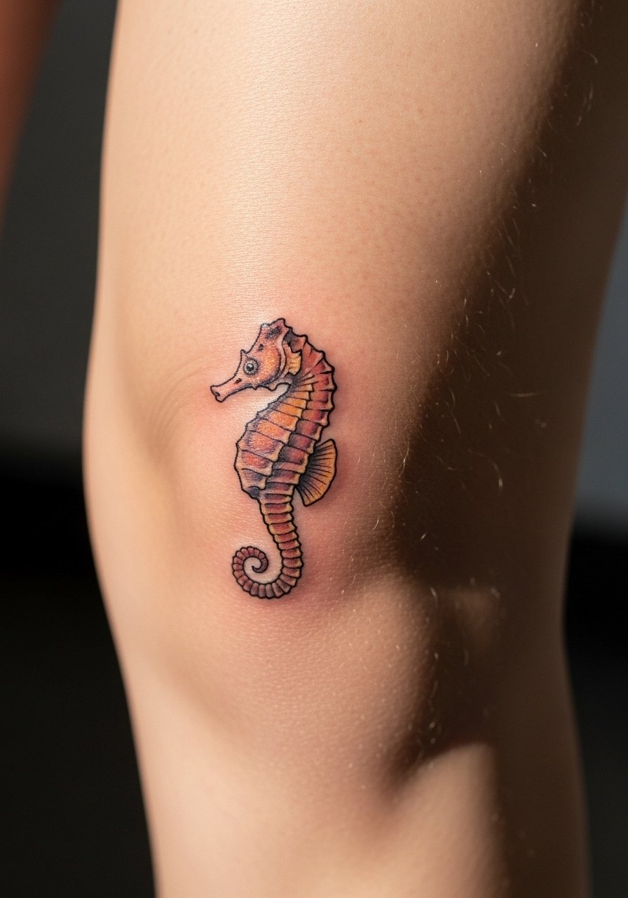 Behind-knee placements are playful but less common, and seahorses represent patience and uniqueness. Pain is variable because the skin there moves and bends; you’ll feel that during the session and in healing. Keep the design simple — small curves and a clear silhouette hold up better than minute scales. I found healing required avoidance of tight leggings for a couple of weeks. Ask your artist how they plan for movement so the seahorse doesn’t distort when you bend your leg.