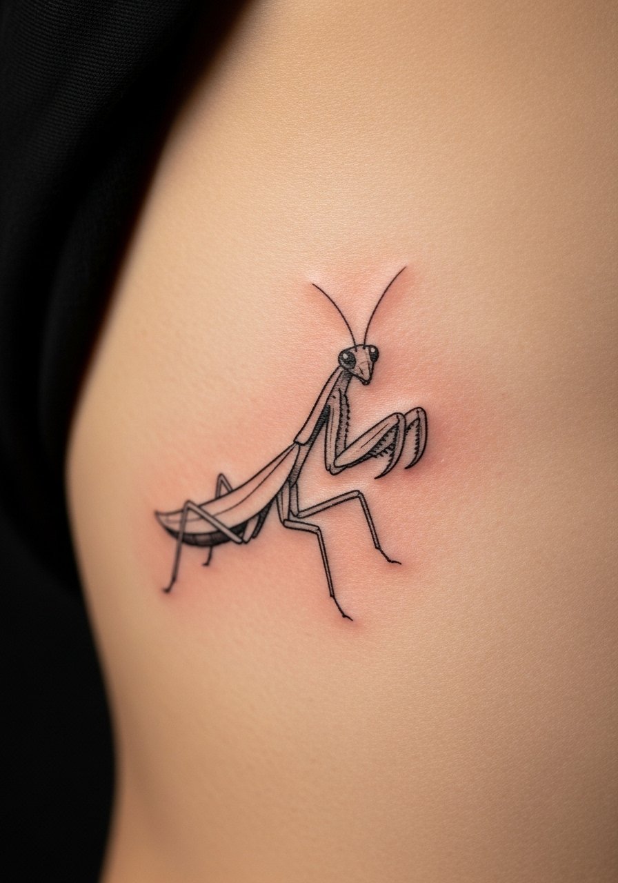 Praying mantis tattoos can symbolize stillness and patience. The rib side is a high-pain area, but a minimalist mantis reads elegantly there. Keep lines simple and slightly bolder than you think so the organism stays visible after healing. I spaced lines to allow negative space to do the shape-work rather than relying on tiny details. Expect tenderness when stretching and avoid abrasive fabrics during recovery.