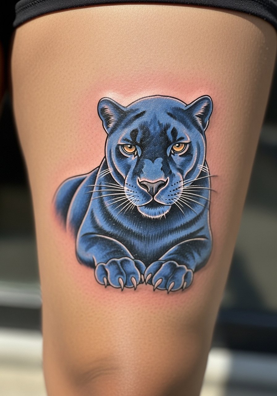A color panther removes the classic black silhouette and gives a mood — midnight blue reads mysterious and modern. Thigh placement offers room for large muscles and color saturation that lasts. Color aging varies by hue, but dark blues often keep richness longer than bright cyan or lime. I had mine layered in sessions to build depth. Avoid using neon colors for shadow regions; they often lose contrast when healed. Ask your artist about pigment choices for longevity on your skin tone.