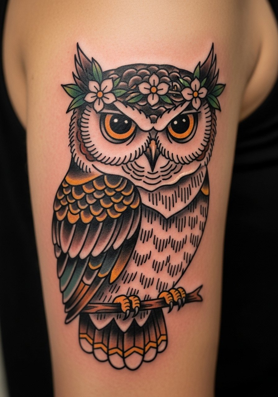 Owls carry wisdom and guardianship. Neo-traditional lets you mix realism with illustrative florals and saturated colors that still respect bold outlines. Upper arm placements are easy to hide if needed and heal well. I liked a palette that used muted jewel tones rather than extreme brightness so the owl kept presence as it aged. Avoid too many tiny petals — flowers look better with clear shapes. In my case, bold eye contrast in the owl kept the expression readable long-term.