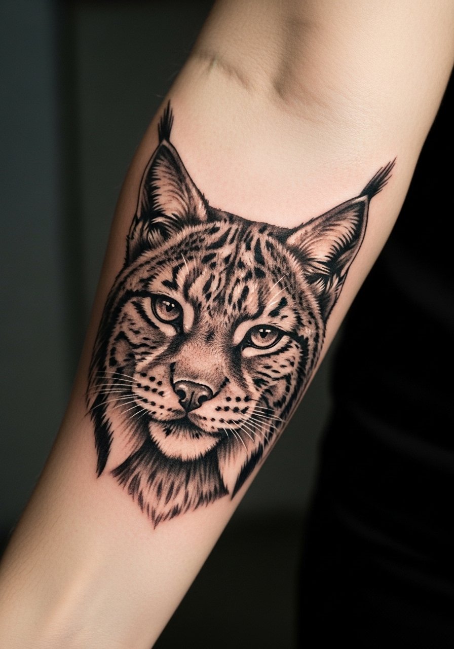 26. Lynx Face on Forearm in Black & Grey