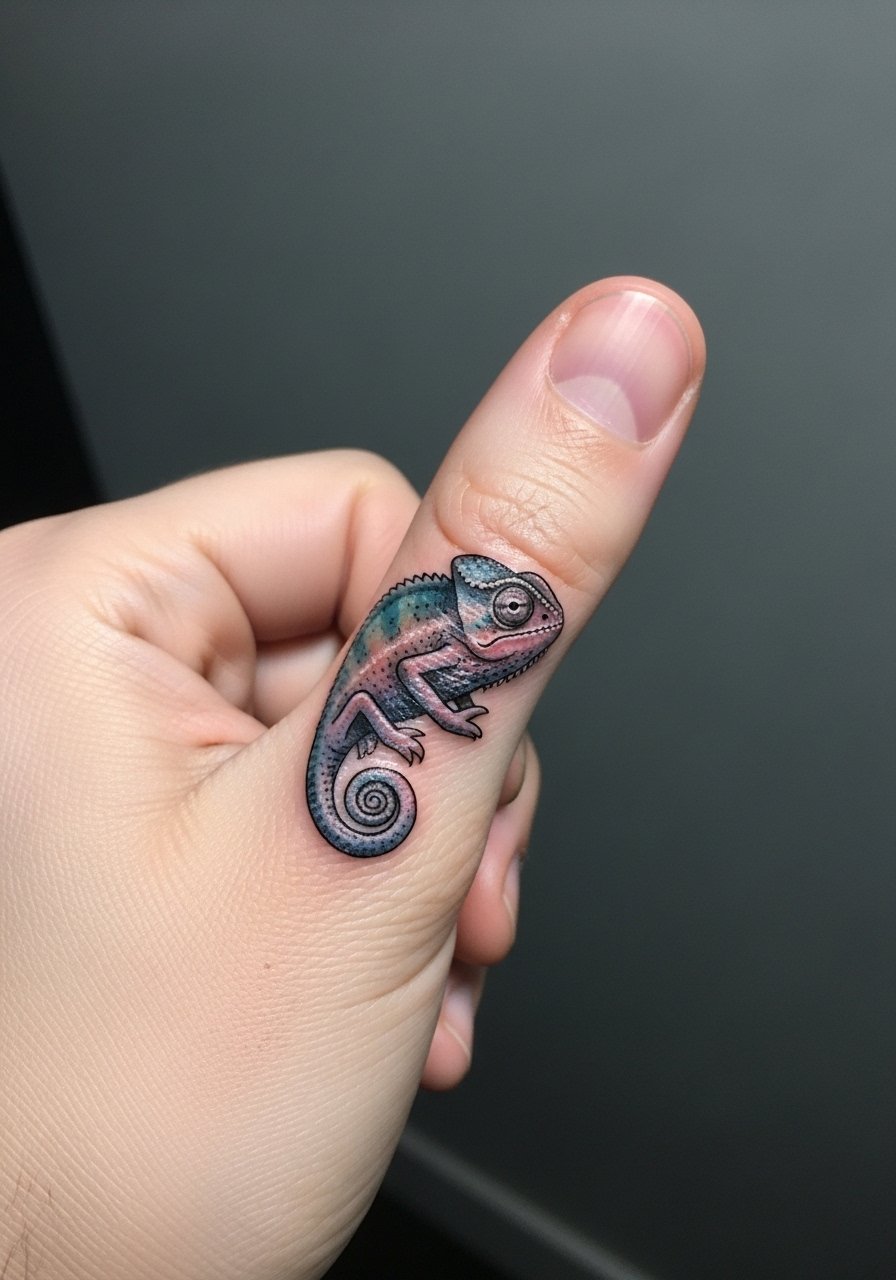 The thumb-web is a small, active area that rubs and washes a lot, but a chameleon there is a cheeky nod to adaptability. Pain can spike due to thin skin and nerve endings. Expect faster fading and possible touch-ups; choose bold lines and solid contrast over tiny texture. I kept mine colorful but simple, and planned for a refresh later. Artists often recommend avoiding white ink in these spots because it disappears quickly.