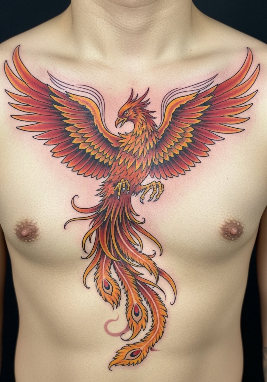 A phoenix is classic for personal rebirth and resilience. Placing it across sternum and upper chest creates a theatrical centerpiece. This is a painful area and requires staged sessions to build color depth without overwhelming your tolerance. Color placement and feather flow should follow chest contours so the wings lift naturally with breathing and posture. I prioritized bold contrast in the core of the phoenix (eyes, beak, chest) so the central motif stayed crisp over time, while wing feathers softened into the skin gracefully.