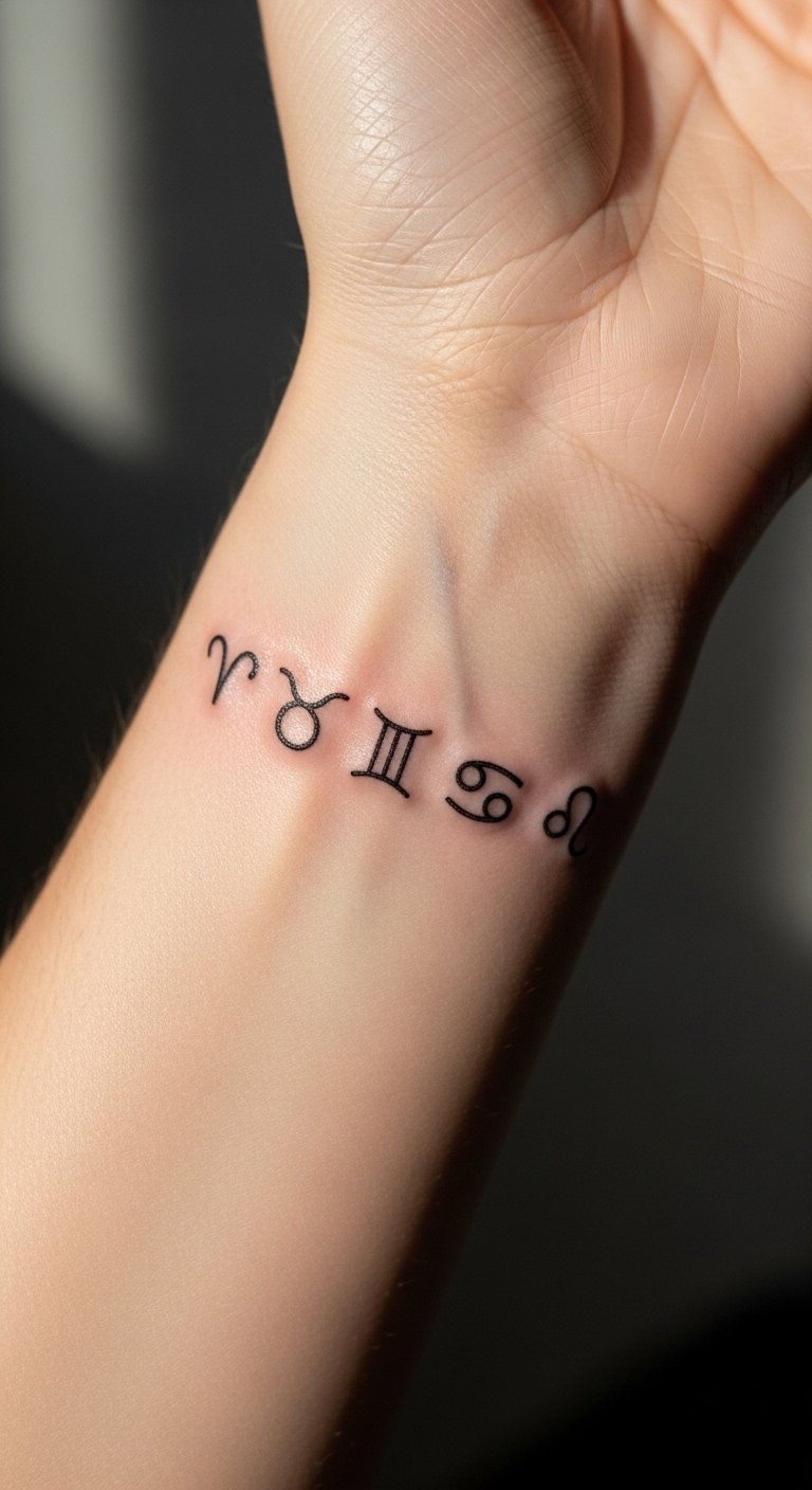 Fine Line Zodiac Glyph Row on Inner Wrist