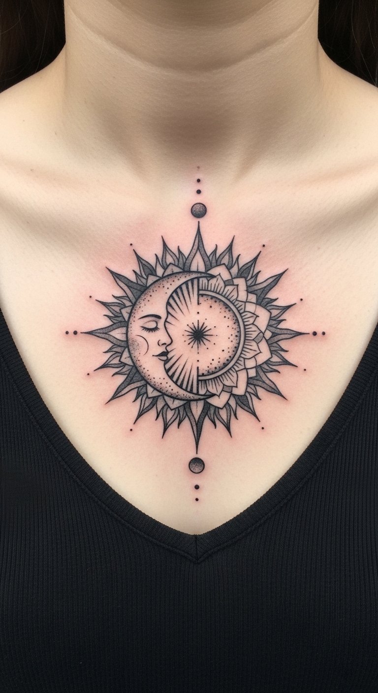 Sternum mandalas centered on a sun/moon motif read like a personal talisman. The sternum is a high-pain area, particularly near the bone, but it’s striking and private when you want it to be. Neo‑traditional shading gives the sun warmth and the moon a soft glow; micro‑realism details can make facial moon features readable. Expect several weeks for surface healing and a few months for full settling. Avoid tiny filigree too close to the bone—those fine details blur fastest. Artists skilled in symmetrical, geometric work are ideal; ask to see healed sternum mandala examples. Related: mandala, neo-traditional, micro-realism.