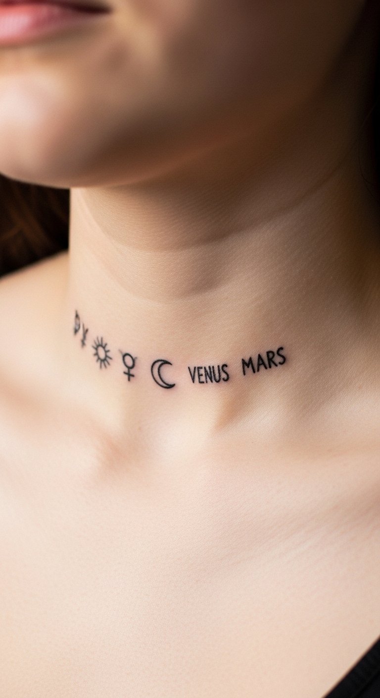 Line up planetary sigils as a literal graph of what matters to you—sun, moon, Venus for love, Mars for drive. Collarbone placements are visible and pair nicely with necklaces. Tiny sigils need careful spacing and a slightly stronger line weight than you’d imagine; otherwise, they can blur together as skin settles. Pain is manageable but the area’s thinner skin makes the sensation sharper than forearm work. Artists who do crisp iconography and small-scale script translate these symbols cleanly. Avoid overloading with too many sigils; pick the ones that carry real meaning for you. Related: planetary sigil, minimalist, glyph.