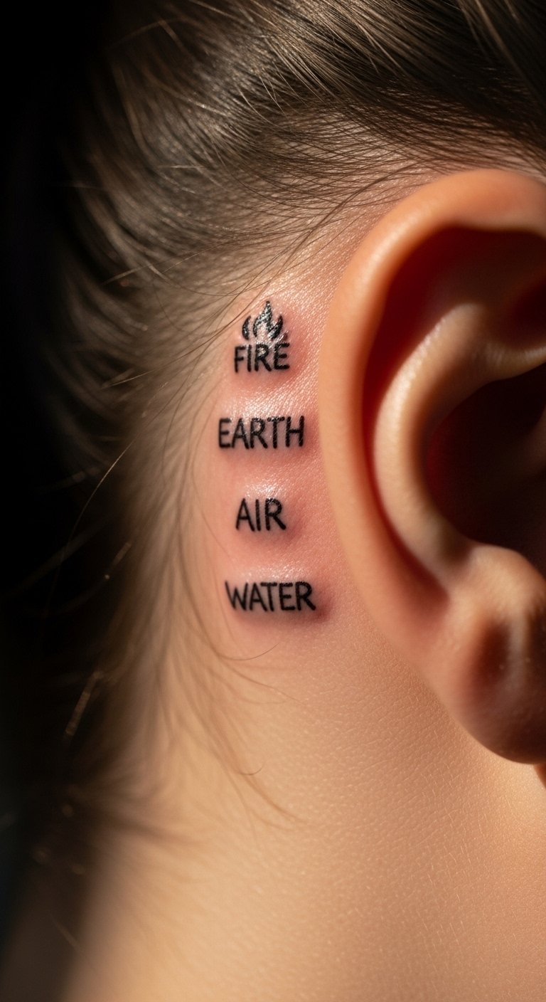 Behind-the-ear element symbols are nearly invisible unless you tuck your hair. They’re great for testing pain tolerance and for small, meaningful ink. The area is bony and can sting; healing is quick but be cautious with earrings or pressure. Single-needle work requires an artist who routinely tattoos tiny icons. The usual mistake is making the glyphs so small they blur into a smudge—scale them slightly larger than you think. Keep in mind hair can irritate the area while healing. Related: element symbols, minimalist, single-needle.