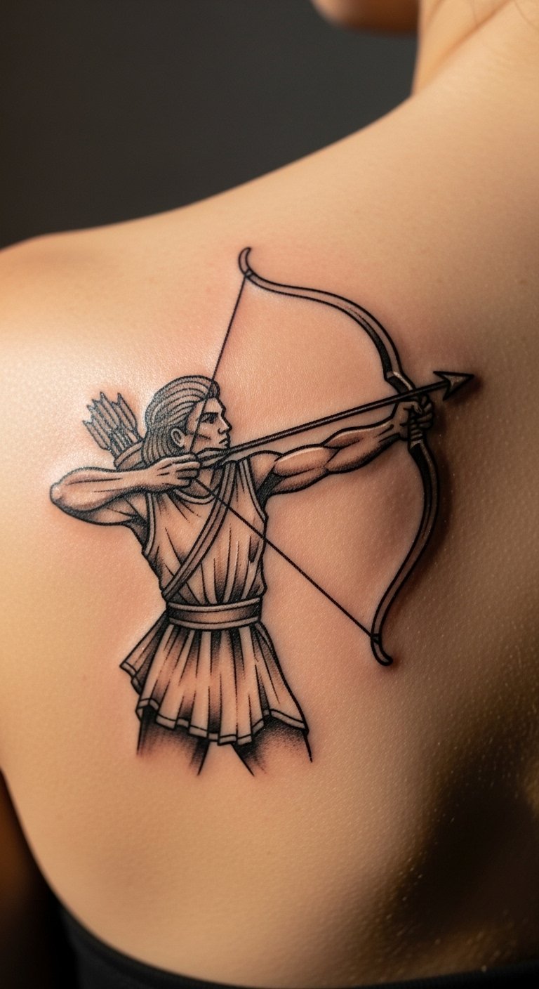An archer across the shoulder blade has an athletic, directional feel. The shoulder blade is a forgiving surface that hides well under shirts. Traditional or illustrative lines keep the figure readable for years; overly thin limbs blur. Pain is moderate—sharp when over bone but otherwise tolerable. Artists who balance bold outlines with selective color—or stick to confident black—make the piece endure. Avoid extreme foreshortening that looks odd when standing; a slightly stylized archer reads best. Related: traditional, illustrative, zodiac animal.