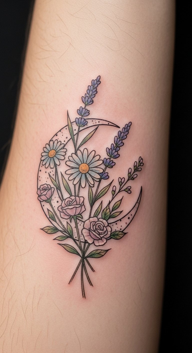 Combining lunar motifs with florals softens astrological imagery into wearable art. Inner forearm placement gives visibility and lower pain; lines settle predictably there. Micro‑realism for petals and fine-line crescent work well together—avoid fussing too many tiny veins that blur. The inner forearm sees sun exposure, so long-term sunscreen is essential to keep contrast. I recommend asking for slightly denser linework in shaded floral areas to prevent early fading. Related: fine line, floral, lunar.