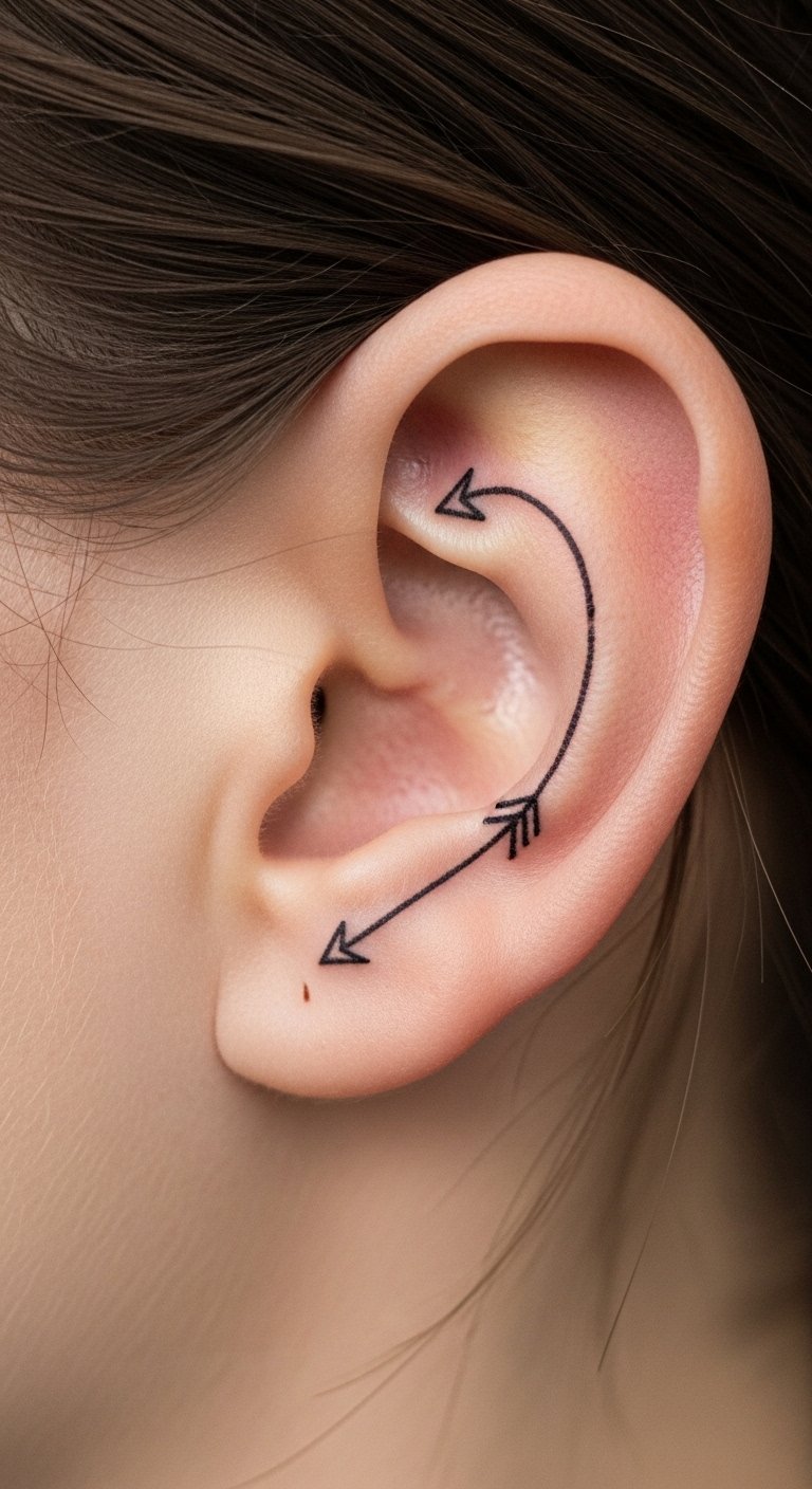 Retrograde arrows are a cheeky, private nod to astrology. Behind-ear placement is discreet and quick to heal but can sting due to thin skin. Single-needle minimalist work must be sized appropriately—too tiny and it will blur into a smudge. I’ve seen this become a favorite "insider" piece for people who love subtle meaning. Related: minimalist, single-needle, glyph.