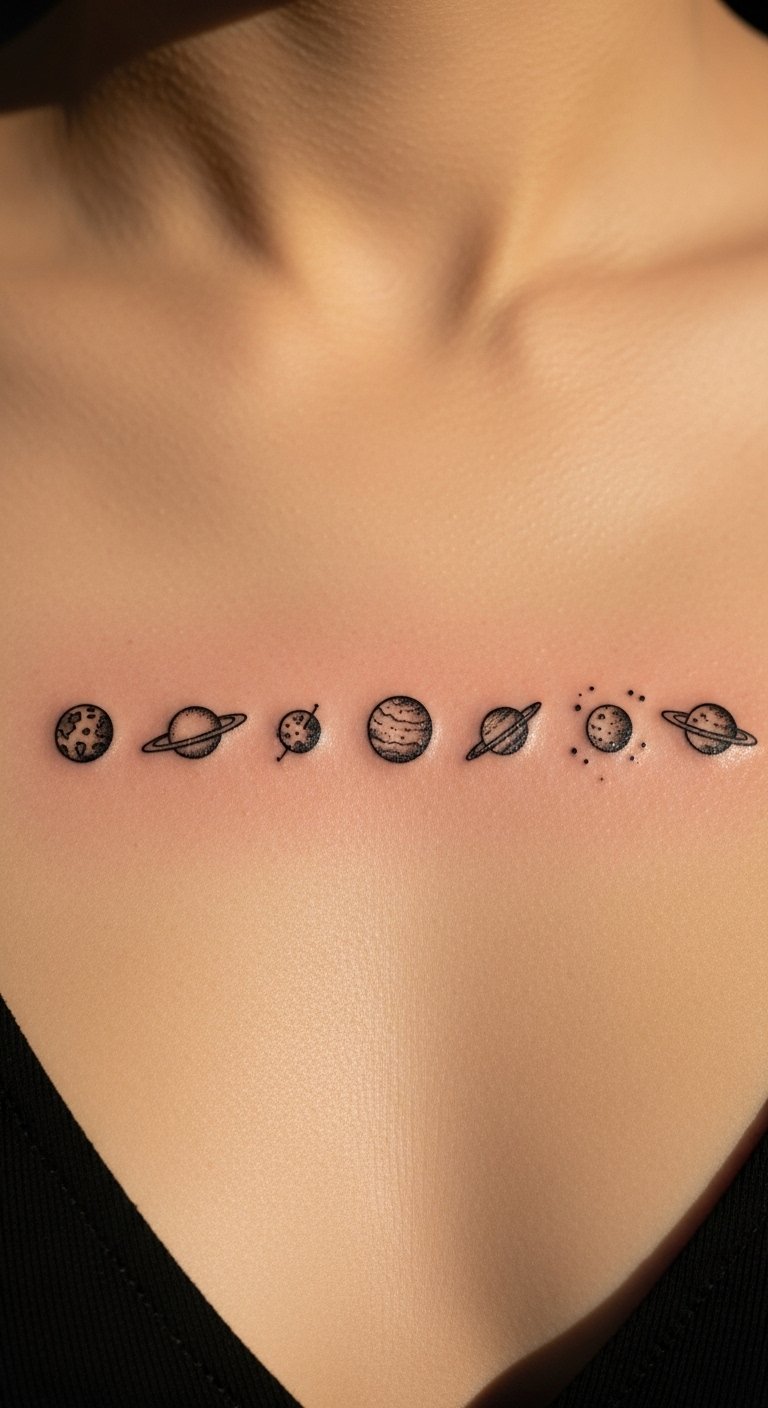 A horizontal planetary line across the sternum reads like a personal constellation necklace. Pain is higher on the sternum, but the visual reward is strong. Keep icons slightly larger than you expect so they stay legible; dotwork can give them texture without clogging. Watch for symmetry—stencils should be checked multiple times with you upright. Related: planetary, fine line, dotwork.