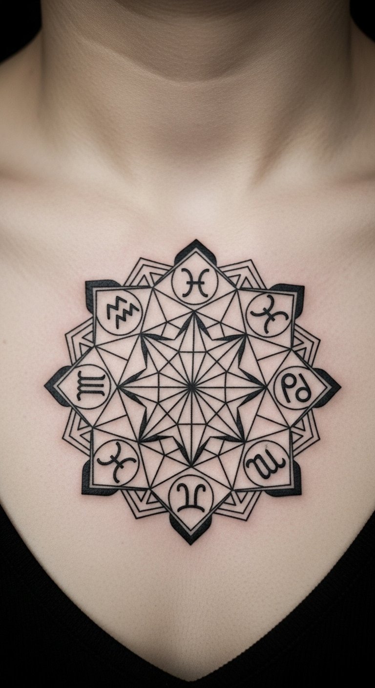 A zodiac mandala centered on the sternum reads like a compact cosmos. Geometric precision matters; choose an artist known for symmetry. Sternum pain is intense near bone but manageable in stages. Blackwork holds up well; keep filigree minimal to avoid future muddiness. A common misstep is over-detailing the inner rings—simpler divisions with clear glyphs age better. Related: mandala, blackwork, zodiac.