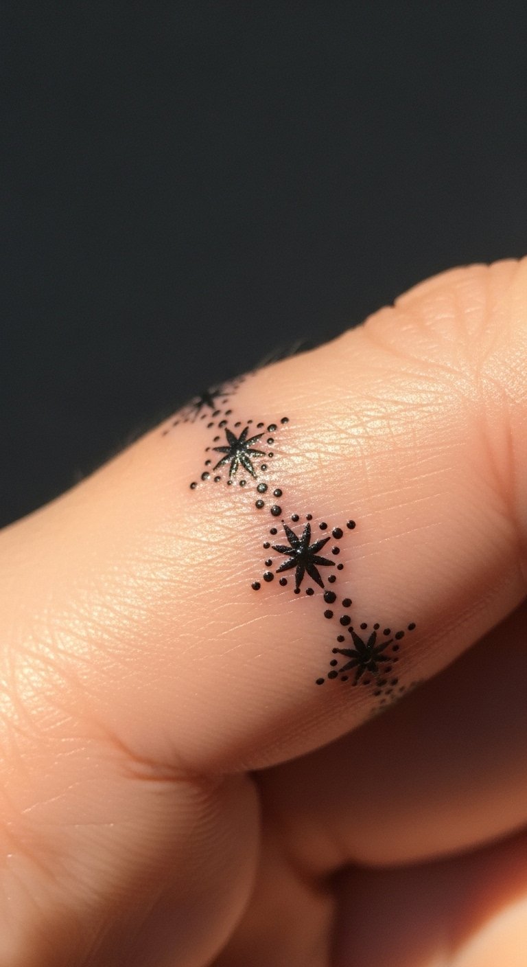 Finger bands are intimate but fade faster due to frequent washing and movement. Micro-dot stars look delicate initially, but plan for touch-ups down the road; artists often recommend bolder dots or spacing to extend life. Fingers hurt more than expected because skin is thin—expect soreness and quick scabbing. If you want a band that lasts longer, consider subtle negative-space designs against a thicker line. Related: micro dots, minimalist, finger tattoo.