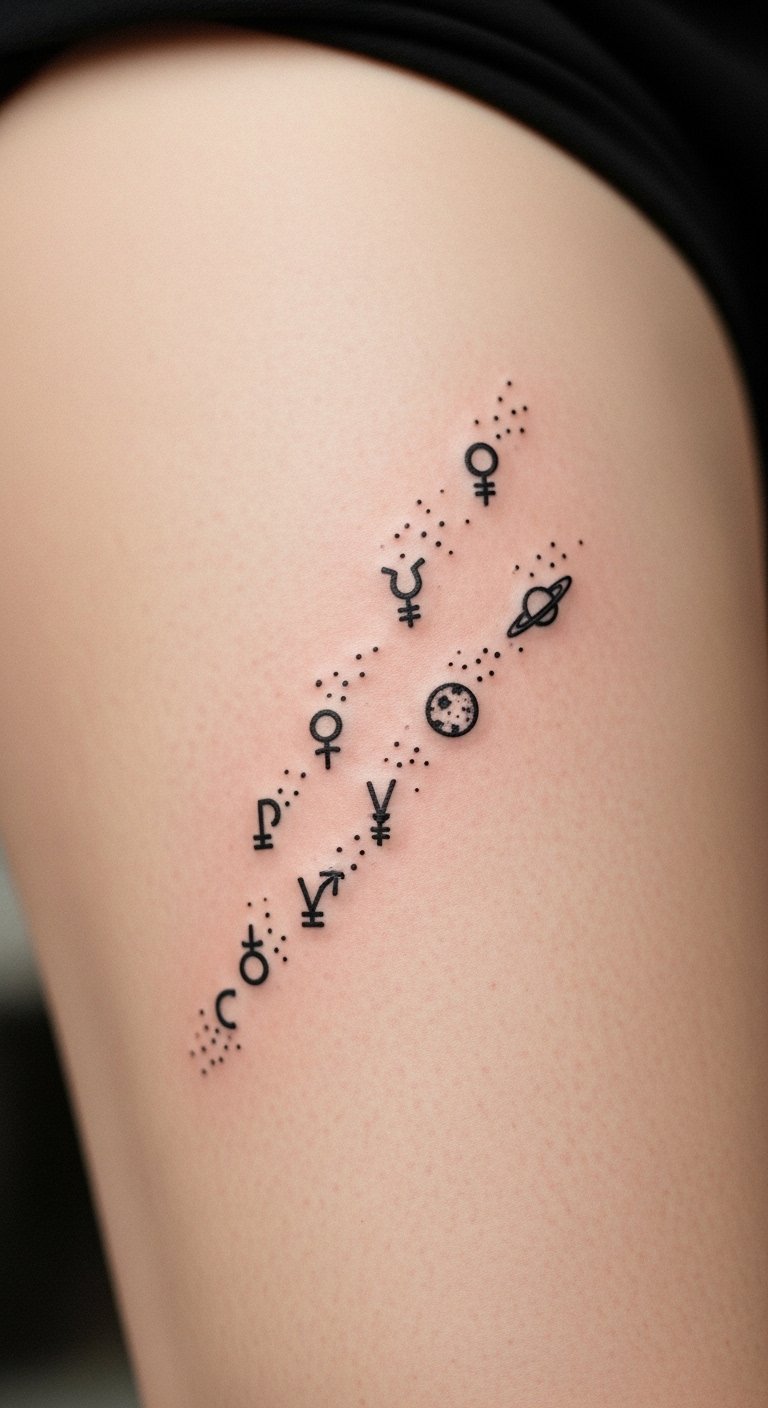 A stellium cluster groups relevant planets in one compact piece; the thigh gives privacy and room to play with scale. Thigh skin heals well with low visibility to sun when covered. Dotwork connectors can make it feel celestial without crowding. Avoid tiny script among the planets; leg movement and skin texture can distort fine text over time. Related: stellium, dotwork, fine line.