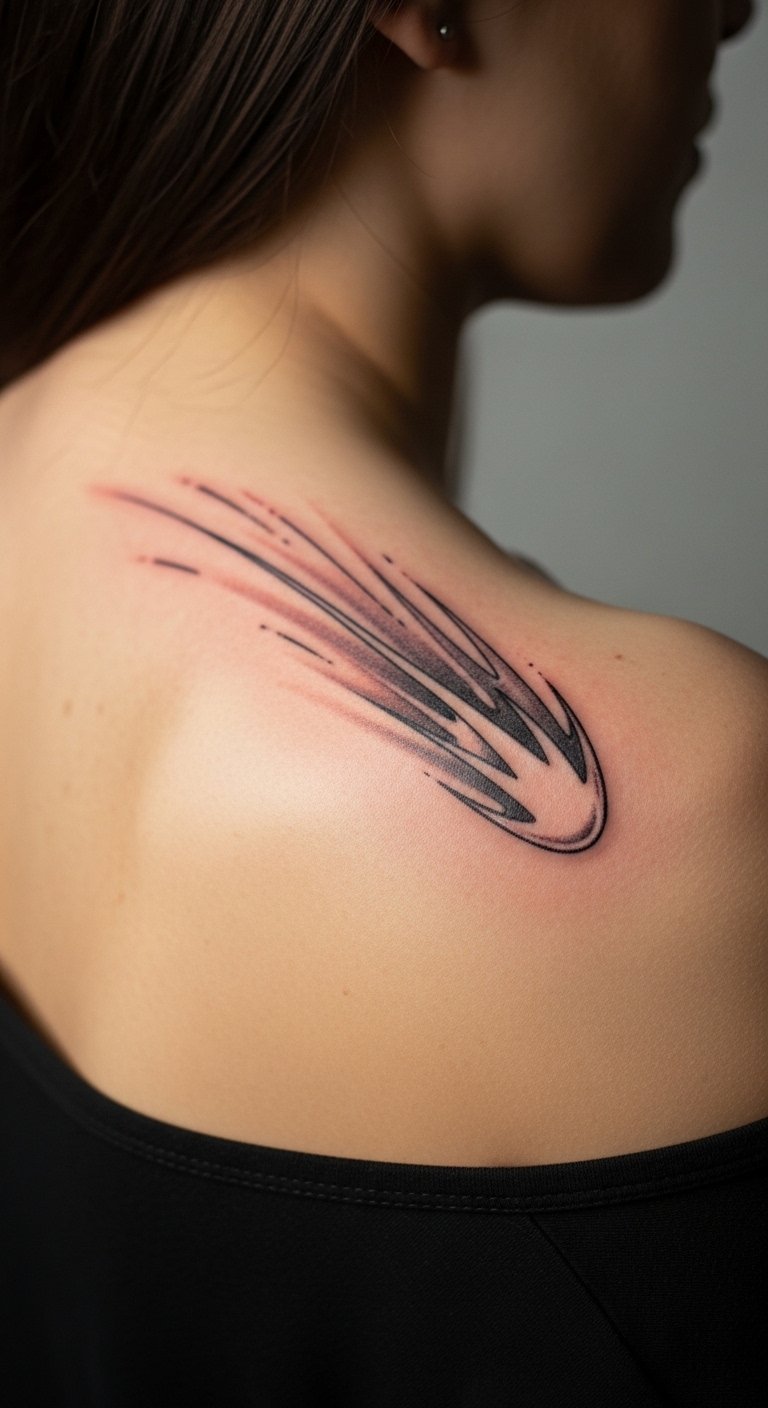 Comet tails accentuate shoulder lines and look great peeking from a strap top. The back of shoulder is forgiving and a smart place for movement-based designs. Keep tail lines slightly bolder so they don’t feather; artists often add small stars or dotwork to anchor the motion. Healing is straightforward with minimal friction. Related: comet, movement, illustrative.