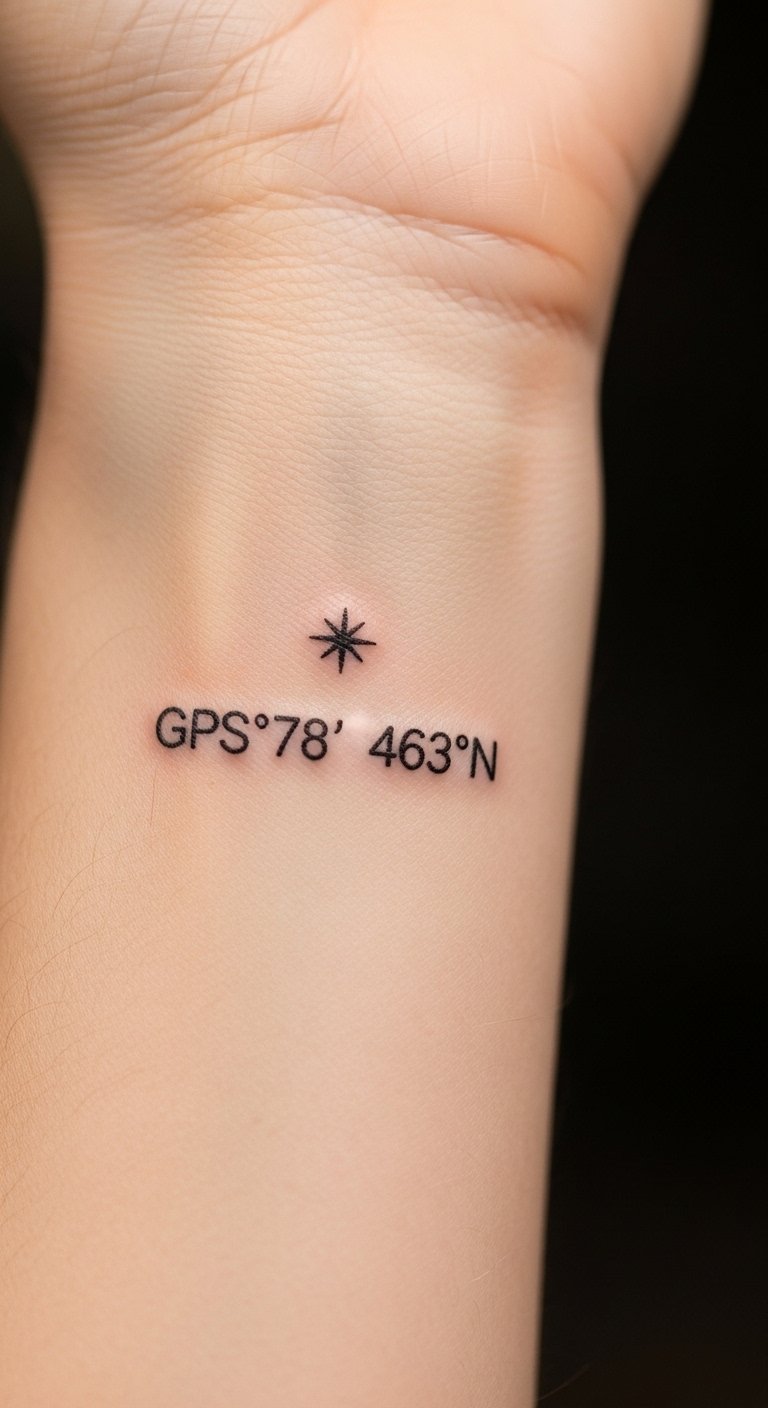 Coordinates tattooed with a tiny star are quiet and intimate reminders of origin. Inner wrist heals quickly but is exposed—use sunscreen long-term. Make sure numerals are bold enough to avoid merging; ask your artist for slightly heavier numerals at small sizes. It’s a great option for people who want astrology tied to place. Related: coordinates, minimalist, personal.