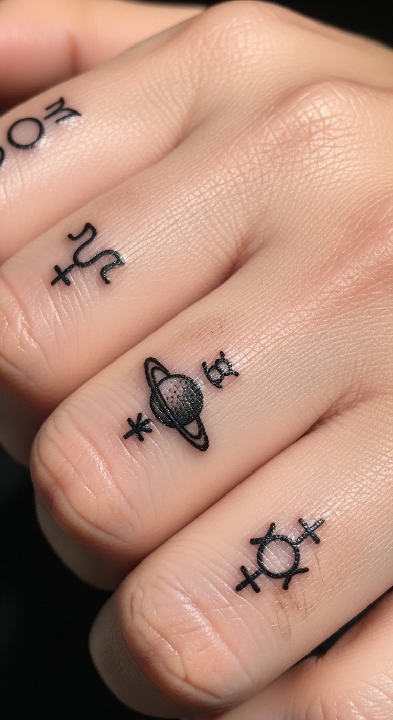 Finger tattoos are visible and meaningful but notorious for faster fading. Planetary sigils look sleek across fingers, but be ready for touch-ups—skin on fingers renews frequently. Pain is sharper on fingers, and healing requires gentle hand care. Artists often recommend thicker line weight or negative-space fills to extend life. If you want a long-lasting finger piece, prioritize boldness over ultra-thin detail. Related: finger tattoo, planetary, minimalist.