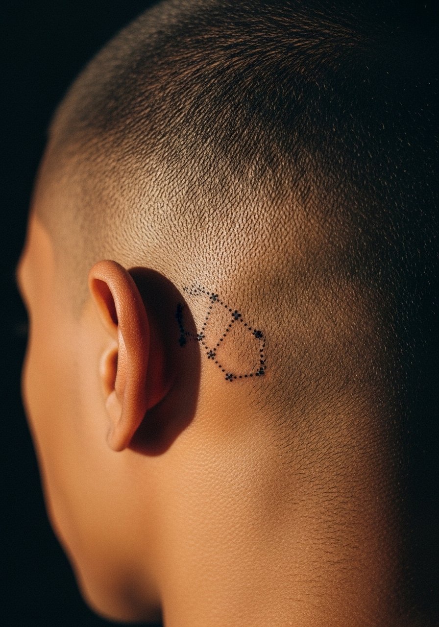 Constellations let you customize meaning without bold lines. Dots and tiny stars age well if spaced properly. Pain is gentle. Healing is simple but avoid rubbing with hairbrushes. I like this when people want a piece that reads differently when hair moves. Don't cluster dots too close—spacing keeps it readable years later.