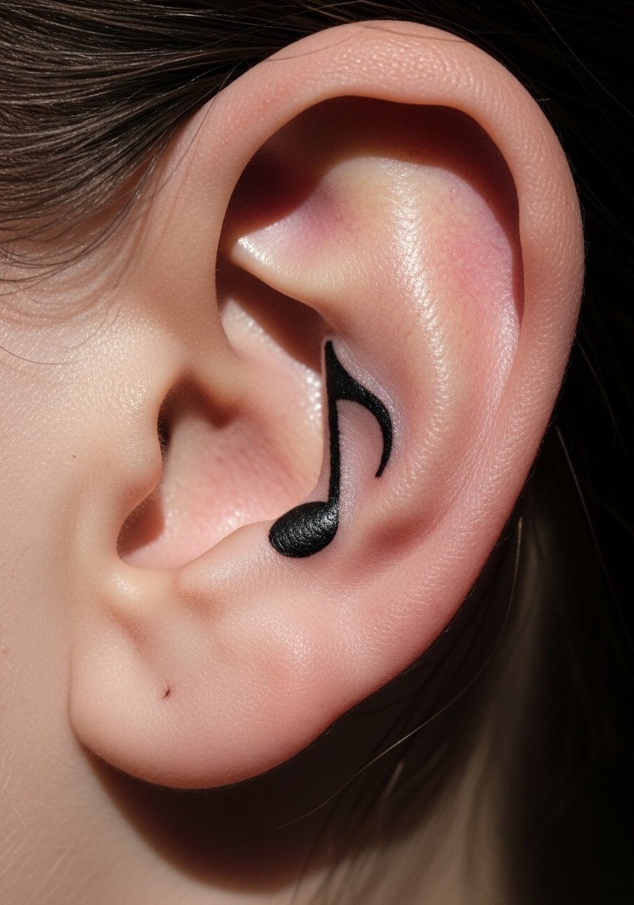 This motif is classic for behind-ear placement because it's playful and discreet. The note holds up well—black ink wins for longevity. Pain is minimal, and sessions are quick. Keep the line weight moderate; ultra-thin notes can lose shape. Mention the obvious: avoid placing it where earrings will rub during healing.
