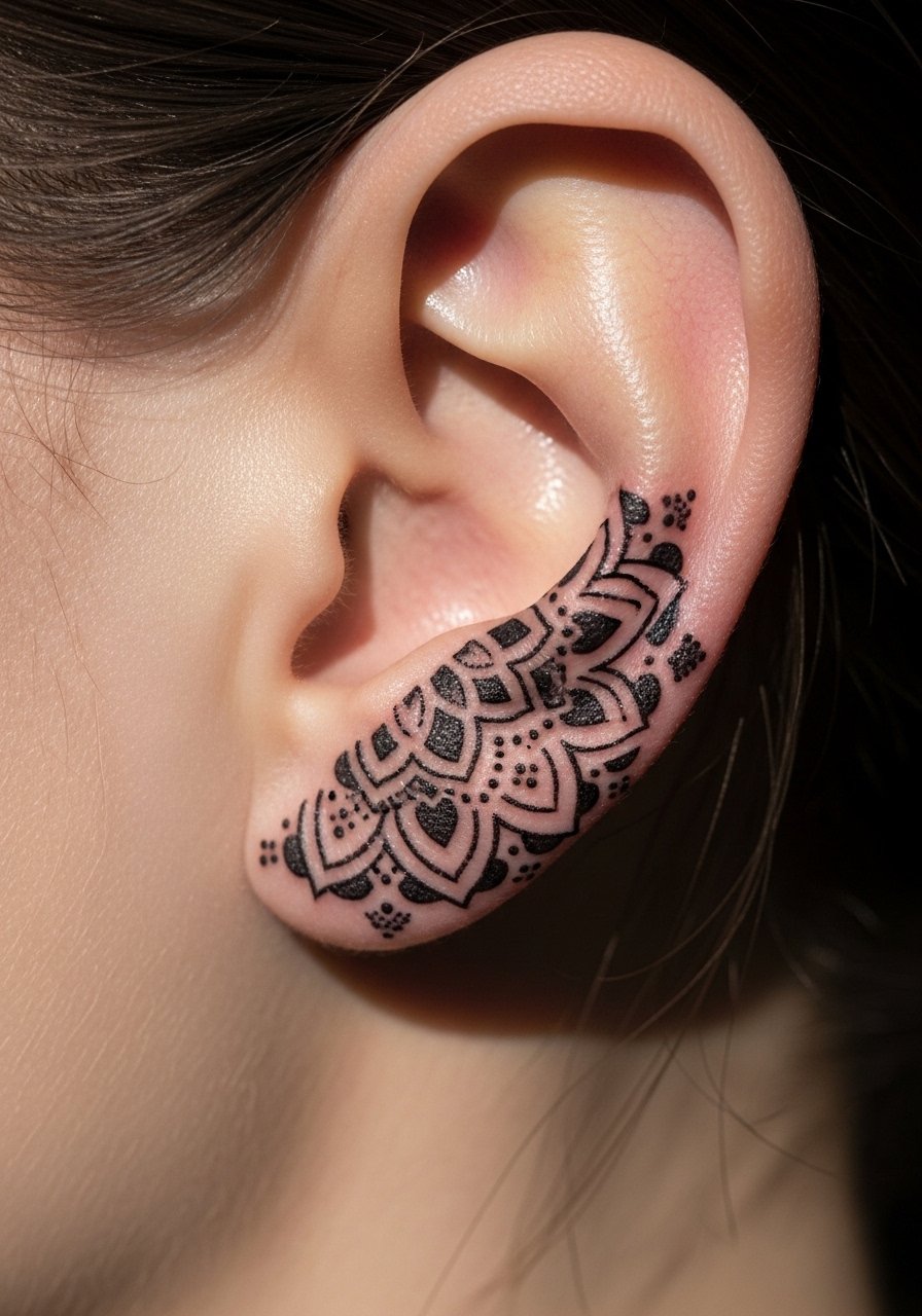 A: Pain is usually low to medium. I rate most behind-ear pieces around 2–4/10—sharp pinches along the fold, but short sessions. If you’re nervous, ask about numbing cream 5% lidocaine, but check with your artist first.