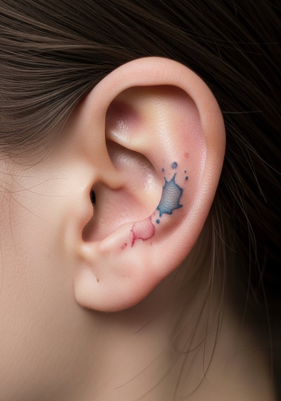 10. Tiny Watercolor Splash Behind Ear (Negative-Space)