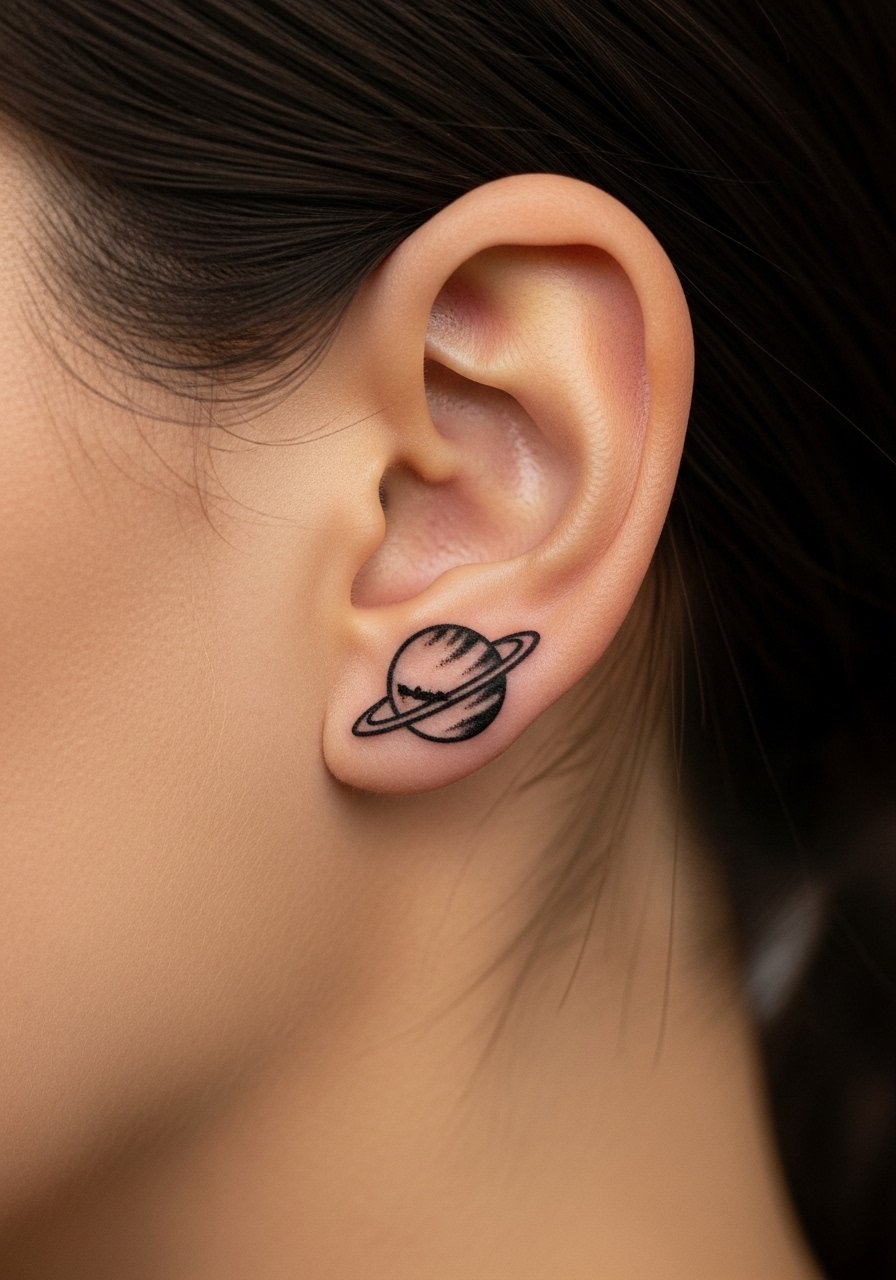 A tiny planet with a thin orbit reads like a secret symbol. Black or dark gray ink keeps it crisp. Pain is minimal because area is small. Healing is quick but avoid hair products that can irritate the area. Keep orbits thin but not hairline-fine—solid micro-lines look better over time.