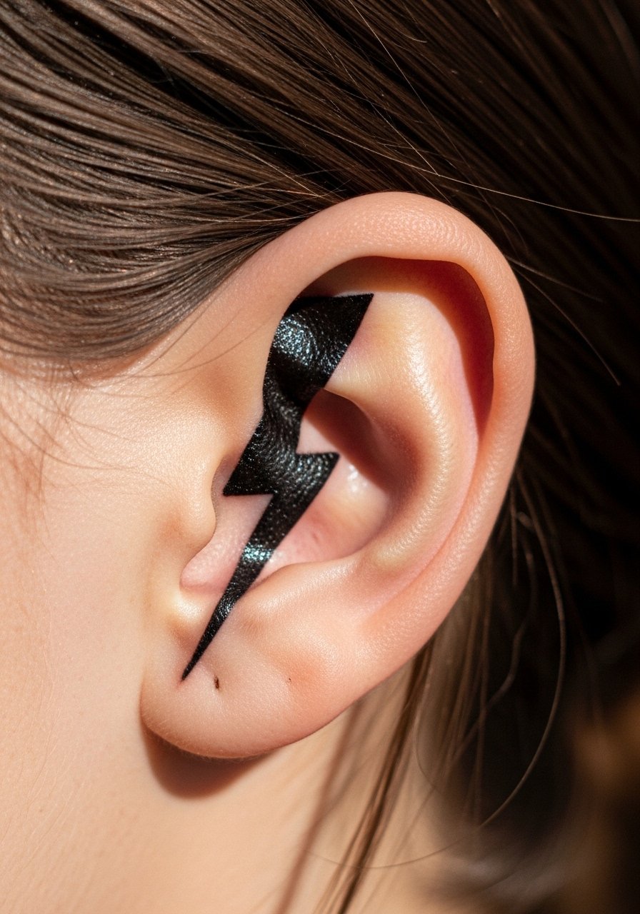 A tiny bolt adds attitude and is easy to place along the ear edge. It holds up because of bold, simple geometry. Healing is easy. Avoid overly skinny bolts; choose solid lines that endure. This is a good placement if you want something visible when hair’s up.
