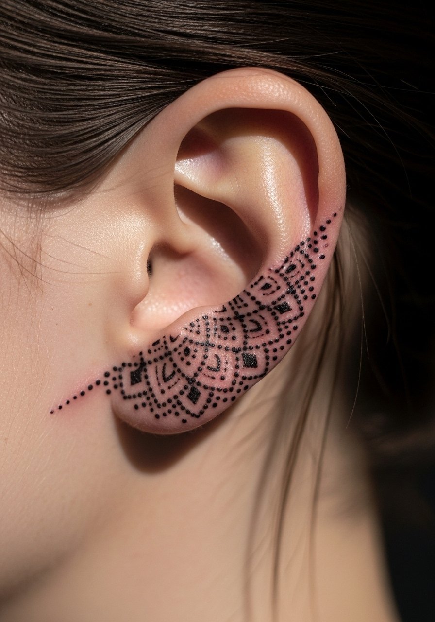 Geometric fragments or small mandala bits look striking here. Solid black and dotwork create contrast against the skin and hair. Expect moderate discomfort during filling. Healing is straightforward but can scab if over-layered—follow moisturization advice. I recommend an artist experienced in dotwork so lines and negative space read after healing.