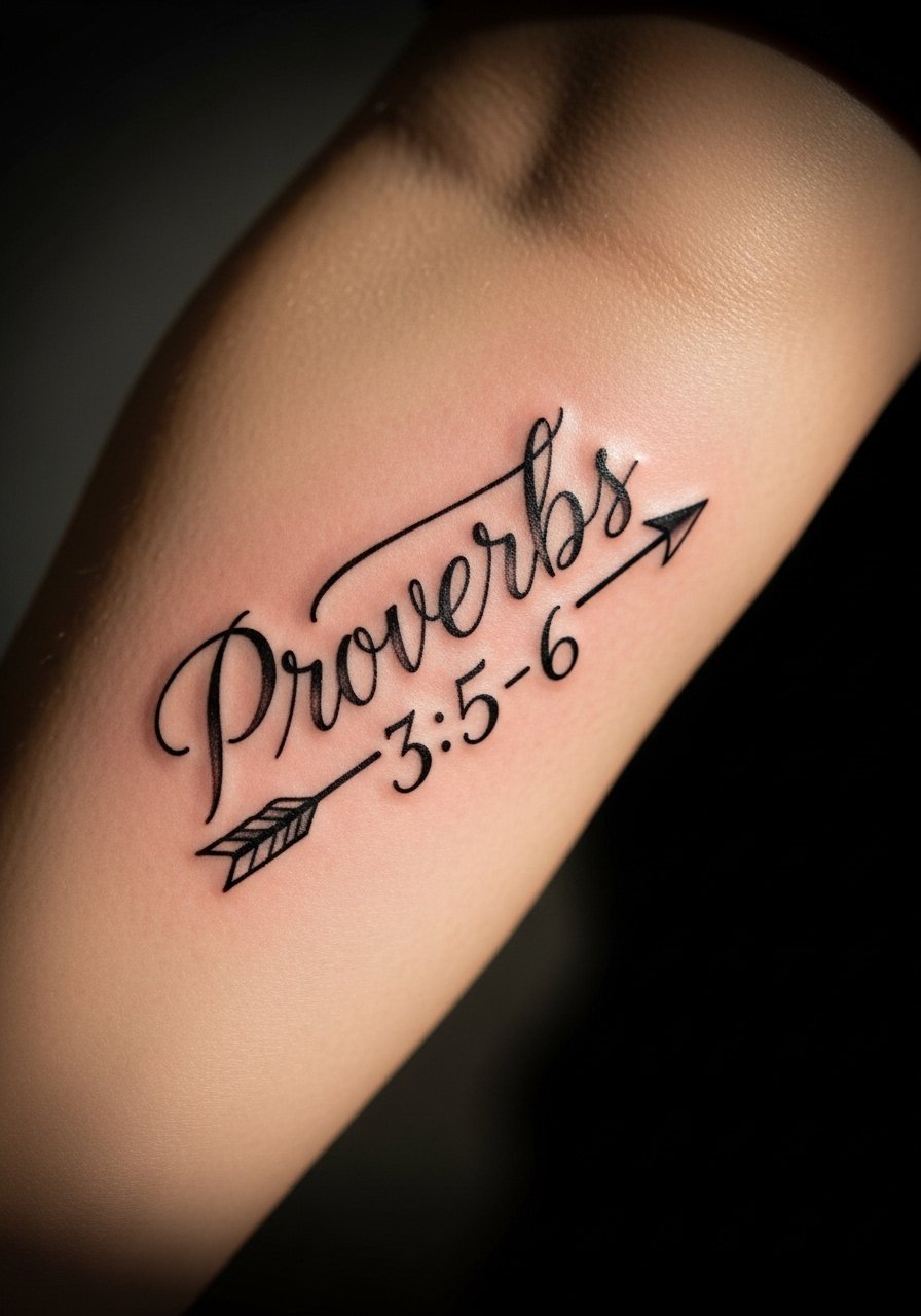 Pairing Proverbs 3:5-6 with a compass or arrow makes the verse feel directional—perfect if you’re navigating life changes. Inner forearm is low-pain and showcases fine linework well. I recommend an artist skilled in lettering plus light illustrative shading so the symbol doesn’t overpower the words. Watch for crowding: keep the compass small so the script remains the focus.