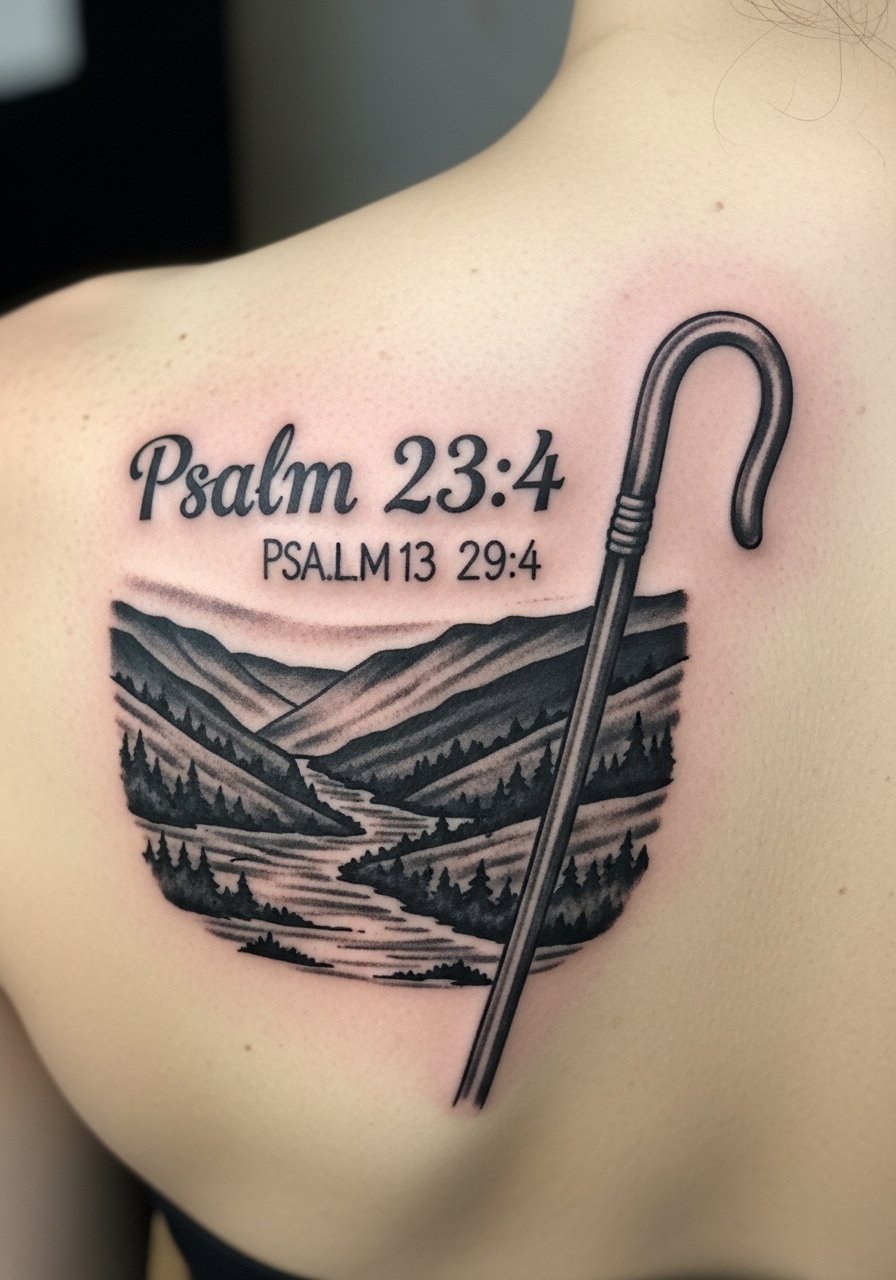 I love Psalm 23:4 paired with a valley and staff—it's a meaningful memorial or resilience tattoo. Shoulder blade allows for a medium-sized neo-traditional scene without constant friction. Expect low-to-moderate pain and predictable healing. Artists who do solid black & gray work will make the script readable long term. Don’t cram too much illustration around the verse; give the words breathing room.