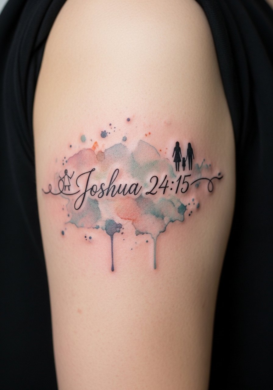 Joshua 24:15 makes a heartfelt family declaration, and watercolor behind script gives it softness. I’ve noticed watercolor looks lovely fresh but can lose vibrancy—so artists often recommend strong black script with subtle color accents. Upper arm placement is forgiving for healing. If you want long-lasting color, request denser pigments and follow sun-protection routines religiously.