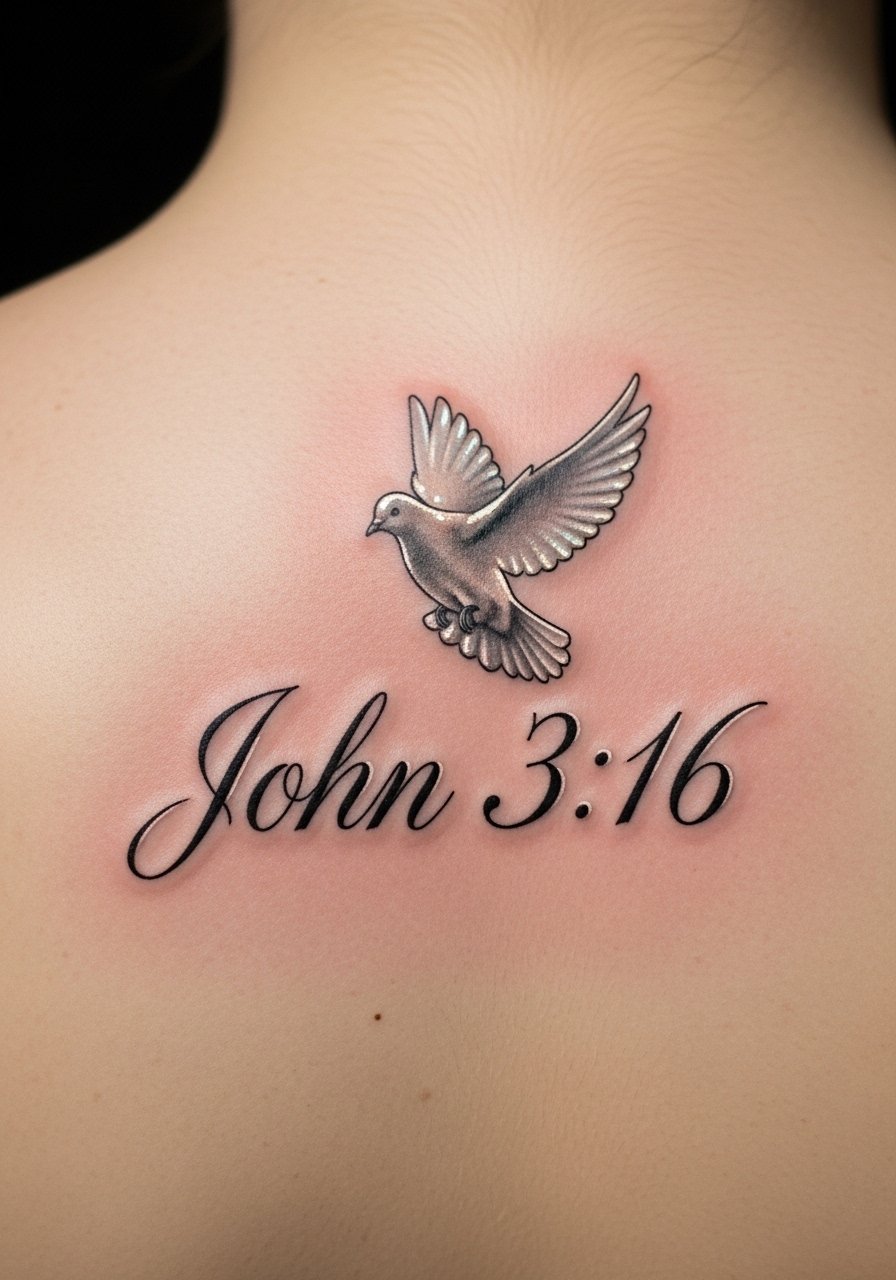 John 3:16 paired with a dove reads as love and peace. Calf or upper back offers space for a slightly larger dove without being obvious all day. In my experience, combining script with a symbol keeps the verse visually interesting and balances the composition. Ask your artist for soft shading around the dove so the script remains crisp.