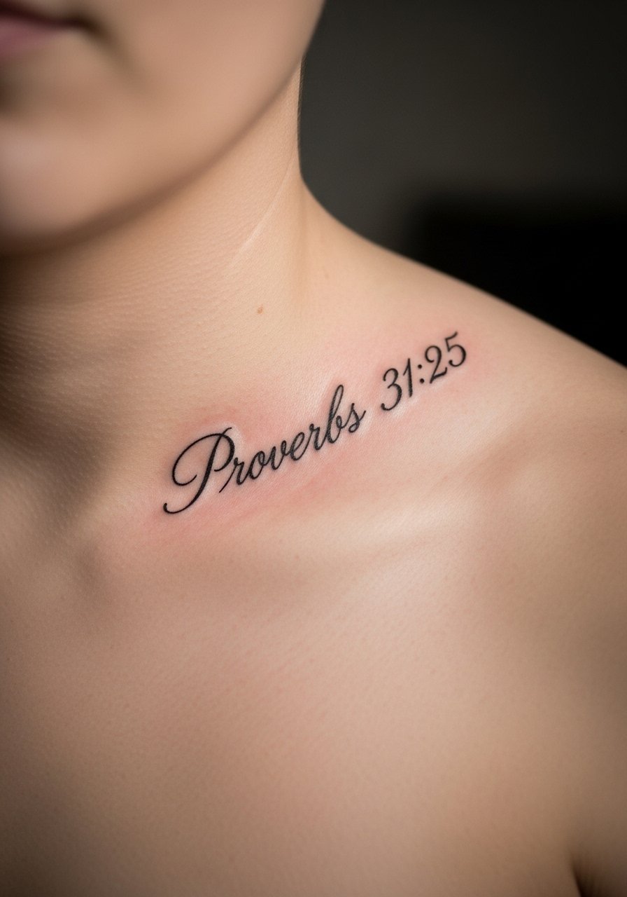 8. Proverbs 31:25 Feminine Script on Collarbone