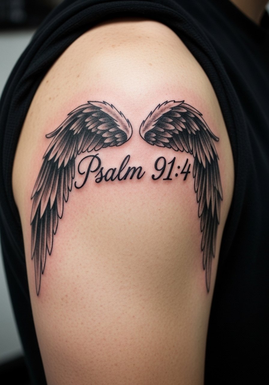 Psalm 91:4 with wings gives literal refuge imagery. Upper arm placement lets the wings spread without distortion. From what I’ve seen, feathers and script age well if the linework is solid and not too fussy. Avoid tiny feather detail next to small letters—symbols need to complement, not compete, with the verse text.