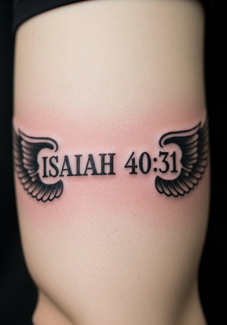 Isaiah 40:31 pairs perfectly with eagle wings on the bicep—very athletic and aspirational. Bicep skin is friendly to bold lines, which helps the text hold up. I’d ask for slightly thicker letters so the verse reads as the wings age. Expect minimal pain and solid longevity if you protect it from sun exposure.