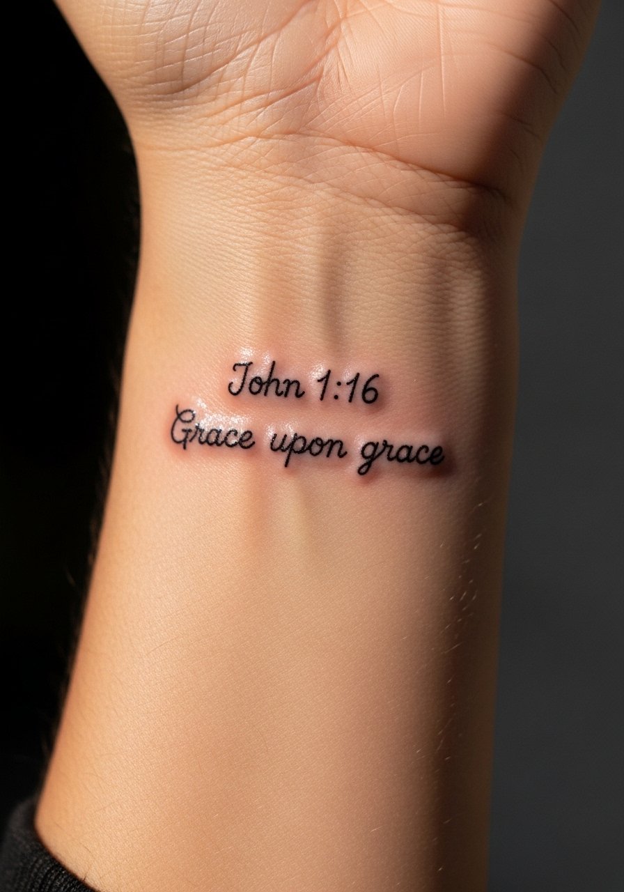 A tiny "grace upon grace" on the wrist is a subtle daily prompt. I’ve noticed tiny wrist scripts can blur if lines are too thin—so choose a steady fine line artist who knows lettering. Wrist skin moves a lot; keep expectations realistic and plan for a touch-up if it softens. Moisturize and avoid constant friction to preserve clarity.