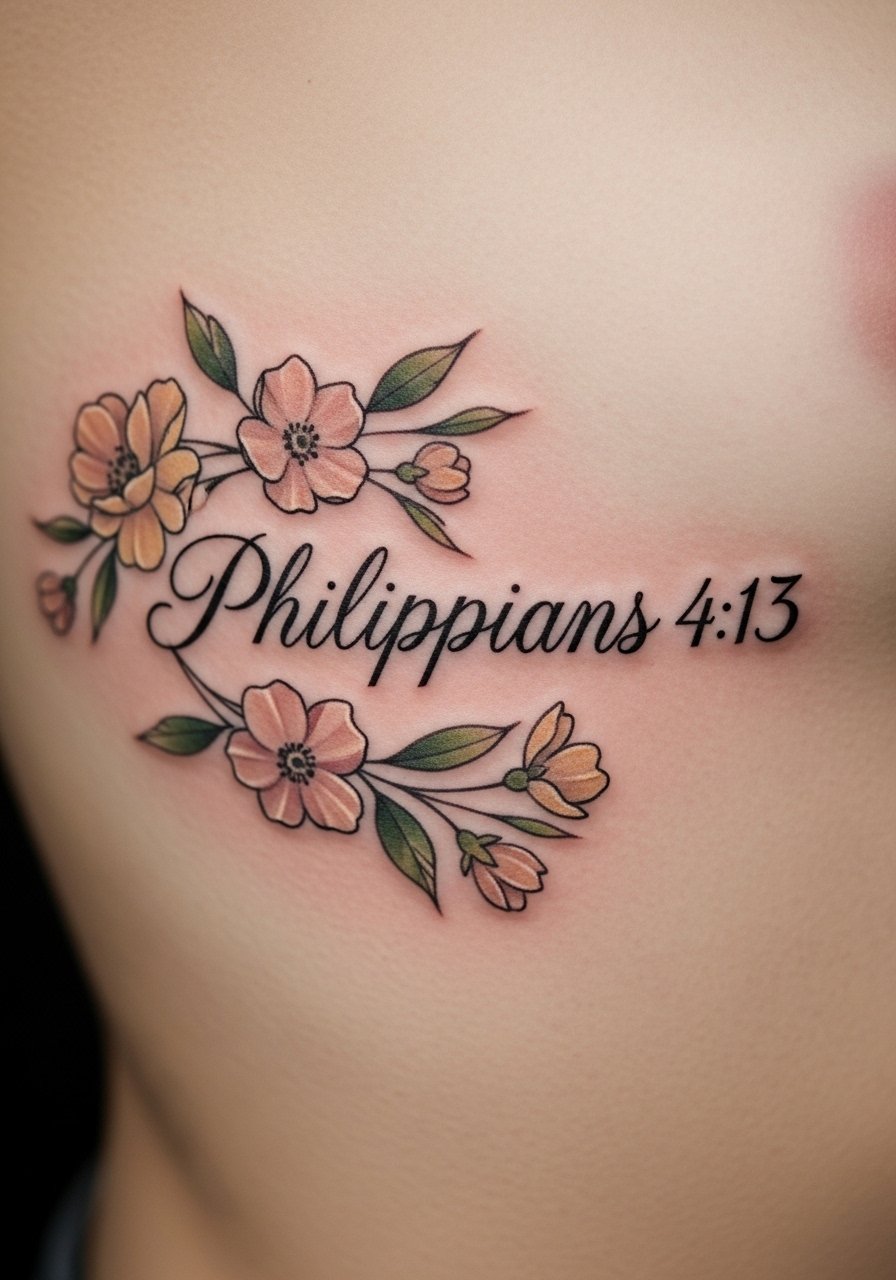 Combining Philippians 4:13 with flowers softens the verse while keeping the message of strength. Ribcage placement hurts more, but results are beautiful. I’ll tell you what artists often say: pair sturdy script with thin floral stems rather than tiny script inside petals. Colors fade faster in this spot—black script plus subtle color accents is the practical compromise.