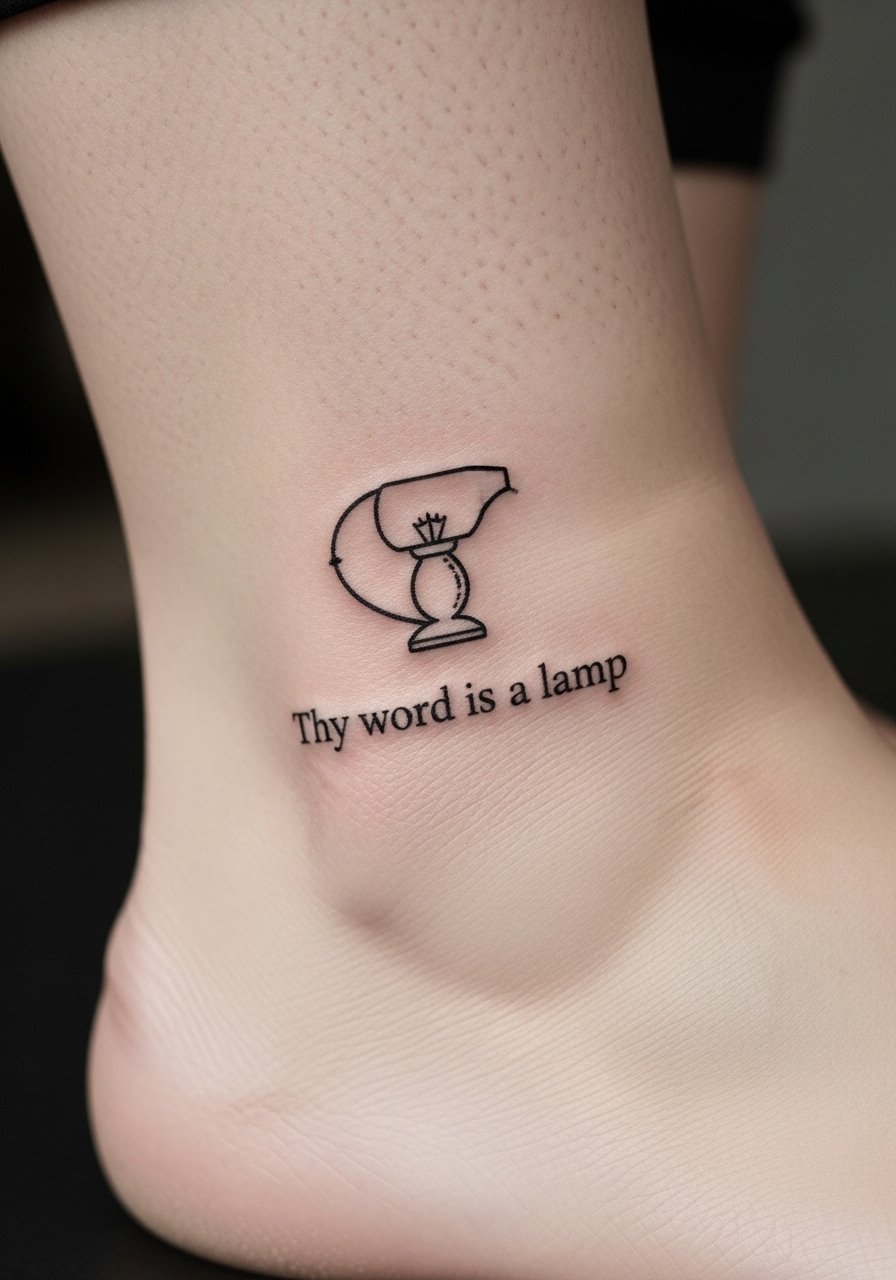 Psalm 119:105 paired with a little lamp is a neat symbolic take on guidance. The ankle is a moveable spot and can be a bit painful. I like this placement for short verse snippets. Keep the lamp small and the script slightly bolder than micro so it remains legible as skin creases.
