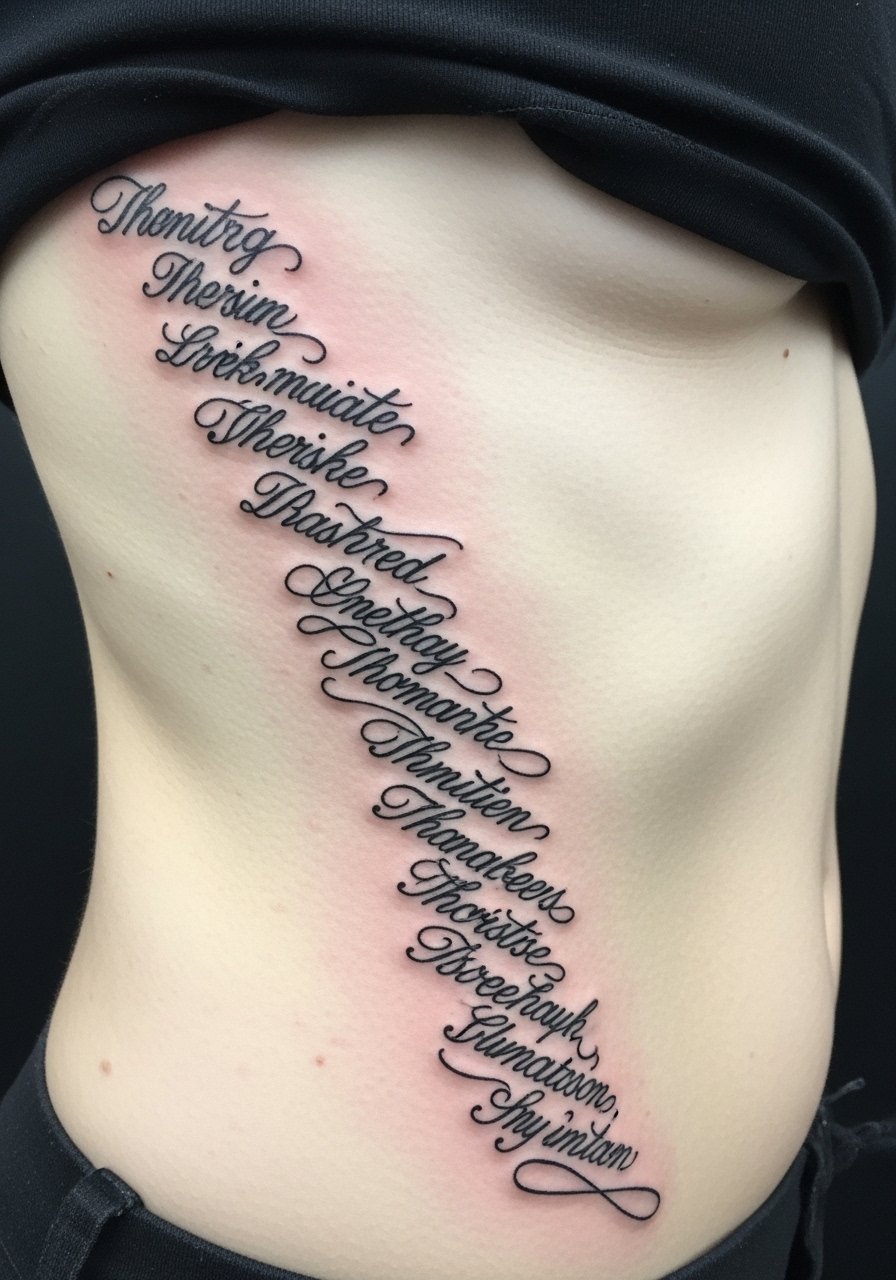 18. Long Script Along Ribcage in Flowing Cursive