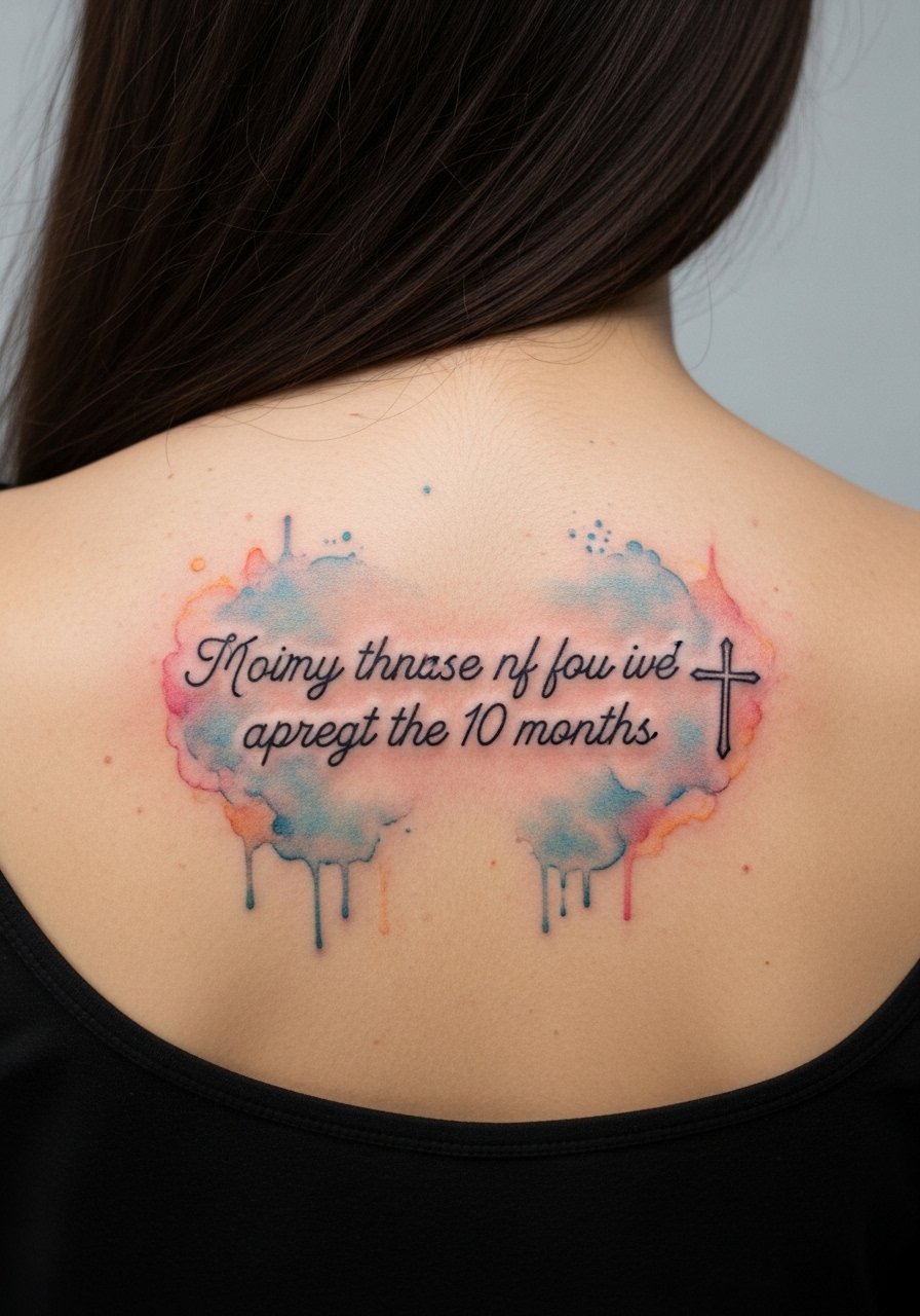 Centering a short verse with a cross and a watercolor halo on the upper back makes for a gentle statement. I’ve noticed watercolor can soften over time, so pair it with strong black script. Upper back heals well and is low-pain relative to ribs. Ask for color touch-up tips and prioritize sun protection to keep the halo from fading.