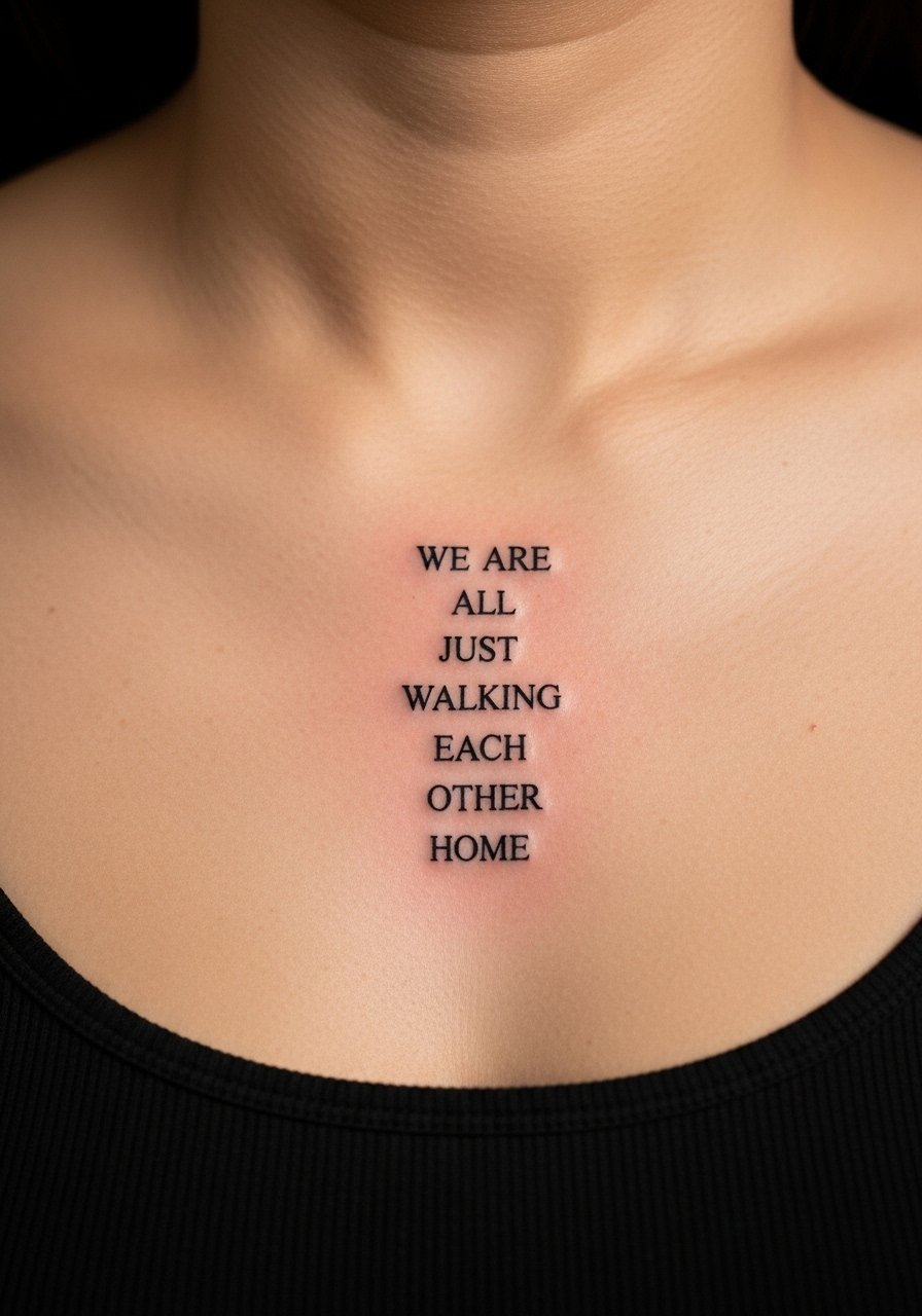 Sternum placements are bold and intimate. I’ve seen short verses here look striking but feel more painful during the session. Choose simple, clean script—ornamentation can blur in this flexing area. Expect longer healing due to clothing friction; a soft bra and gentle cleansers help the process.