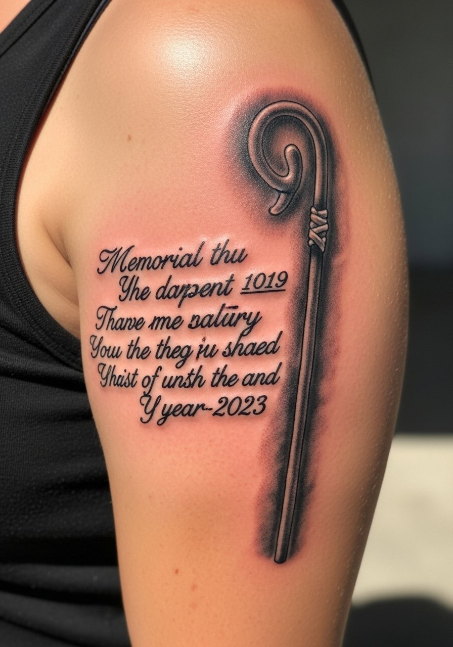 Memorial verses with a shepherd staff give structure to grief and remembrance. Upper arm placement keeps it private but viewable when you want. I’ve found that pairing a short line with a small icon makes the meaning clear without overcrowding. Keep the date in a smaller but legible script; spacing is everything to avoid a cramped look.