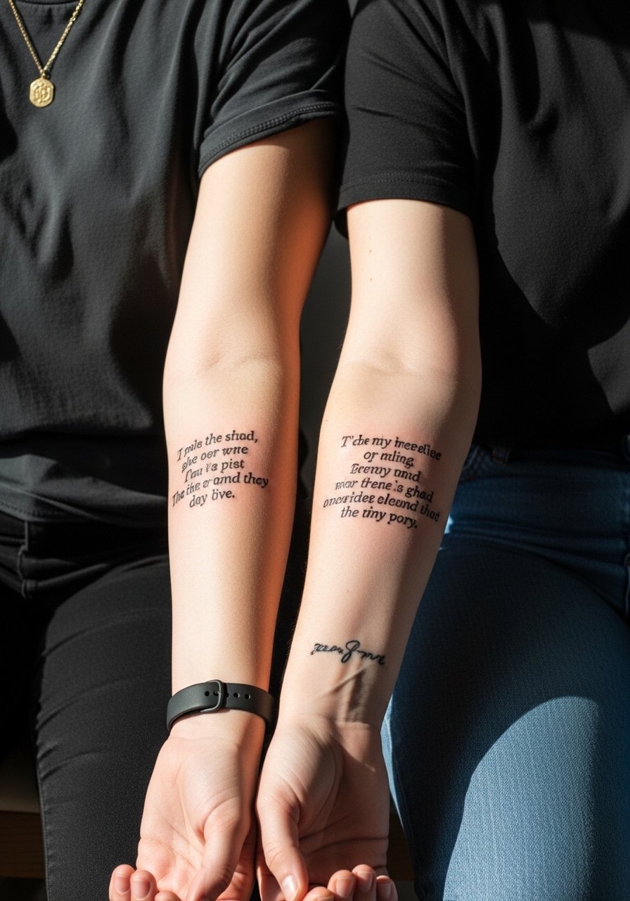 Matching verses for partners or family members are timeless. I’ve seen matching inner forearm or ankle placements read as both personal and public. Keep the script consistent—same artist, same hand lettering style—so the pieces age together. If you plan to match later, coordinate ink tone and line weight to avoid mismatch over time.