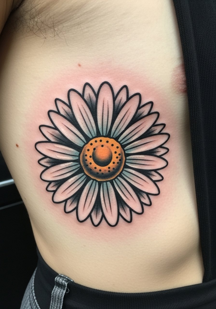 The ribcage hurts. I say that up front because many people plan this for a meaningful April mark without thinking about pain. Pain sits around 7 out of 10 for most. Traditional style with bold outlines works best on ribs, because lines hold longer on that skin. Session time can be 2 to 3 hours if color is involved. I've seen traditional daisies that stay crisp for years when the outline is given room. A common mistake is packing tiny details into petals. They disappear. Tell your artist you want clear black lines and solid color blocks, not micro-shading. Keep movement light while healing, and avoid tight clothing rubbing the area.